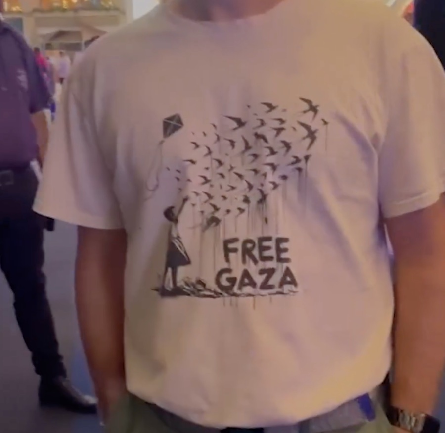 Last weekend, two people were refused entry into London's O2 Arena because one of them was wearing a shirt that said "Free Gaza." When the man wearing the shirt offered to turn it inside-out, security -- saying they were simply abiding by venue "policy" -- told him he still wouldn't be admitted, because he could theoretically turn the shirt back out again. Security also refused to give the man a different shirt to wear, and wouldn't even give him a discount at the venue's merch store. The other person with him luckily took a video of the incident, which went viral, and prompted the venue to issue an apology.