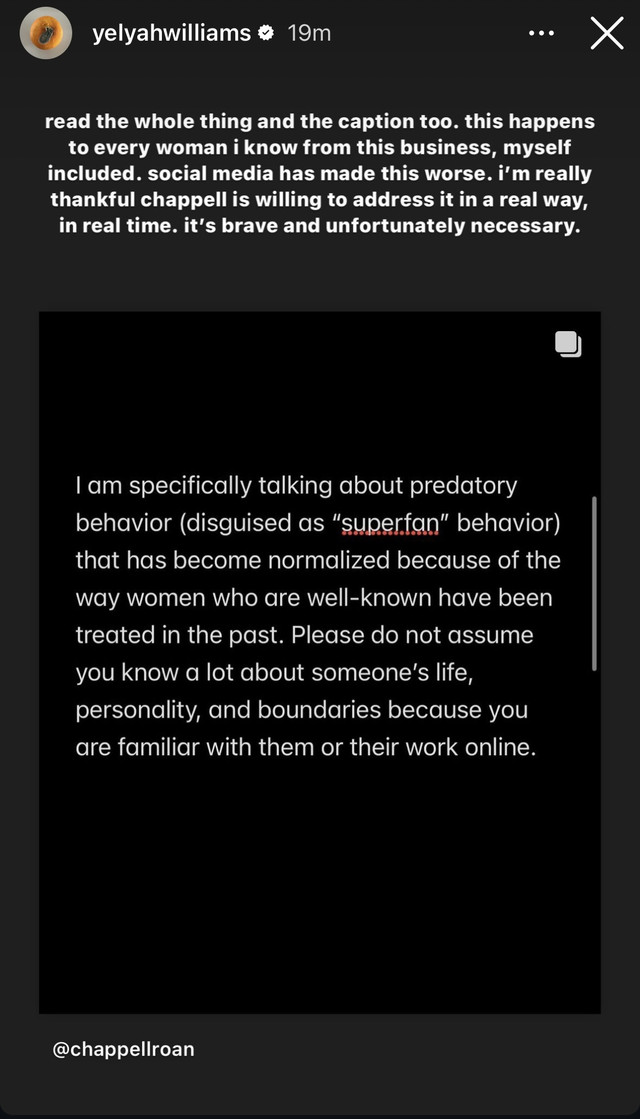Paramore leader Hayley Williams shared the post to her Instagram Story, writing, "read the whole thing and the caption too. this happens to every woman i know from this business, myself included. social media has made this worse. i'm really thankful chappell is willing to address it in a real way, in real time. it's brave and unfortunately necessary."