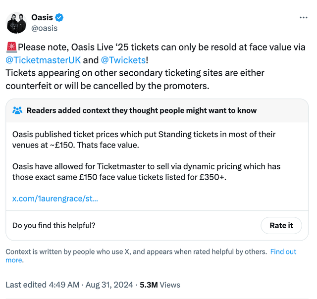 UPDATE: In response to the Oasis situation, the UK's Competition And Markets Authority has opened an investigation into Ticketmaster and its use of "dynamic pricing."