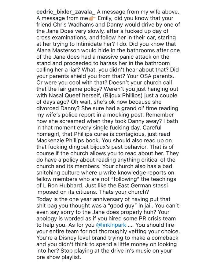 Linkin Park's new vocalist is still a scientologist as far as i can tell. She has been credibly accused of supporting Danny Masterson by Cedric Bixler, vocalist of At the Drive in, former scientologist, whose wife is one of Danny Masterson's victims. https://t.co/F4WorIWMss pic.twitter.com/oZE3FtZgMh