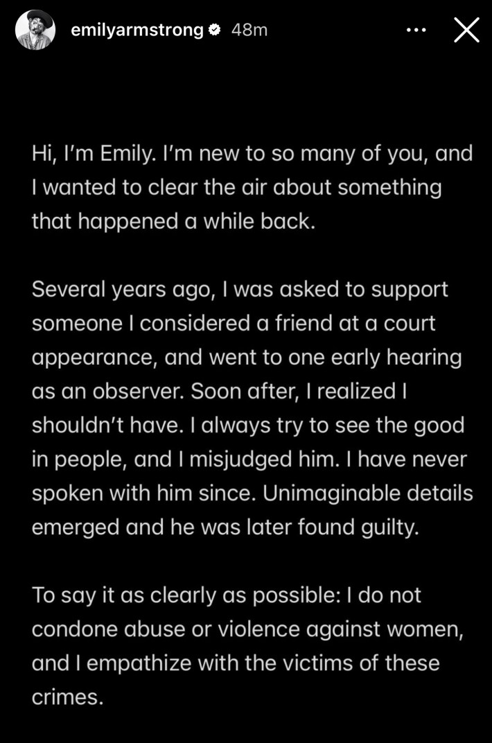 In awe of [Emily Armstrong] and [Colin Brittain] for their talent, passion, and partnership. Deep gratitude to all my bandmates for their humility, hard work, and friendship.