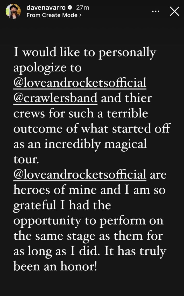 This weekend has been incredibly difficult and after having the time and space to reflect, it is only right that I apologize to my bandmates, especially Dave Navarro, fans, family and friends for my actions during Friday’s show. Unfortunately, my breaking point resulted in inexcusable behavior, and I take full accountability for how I chose to handle the situation.