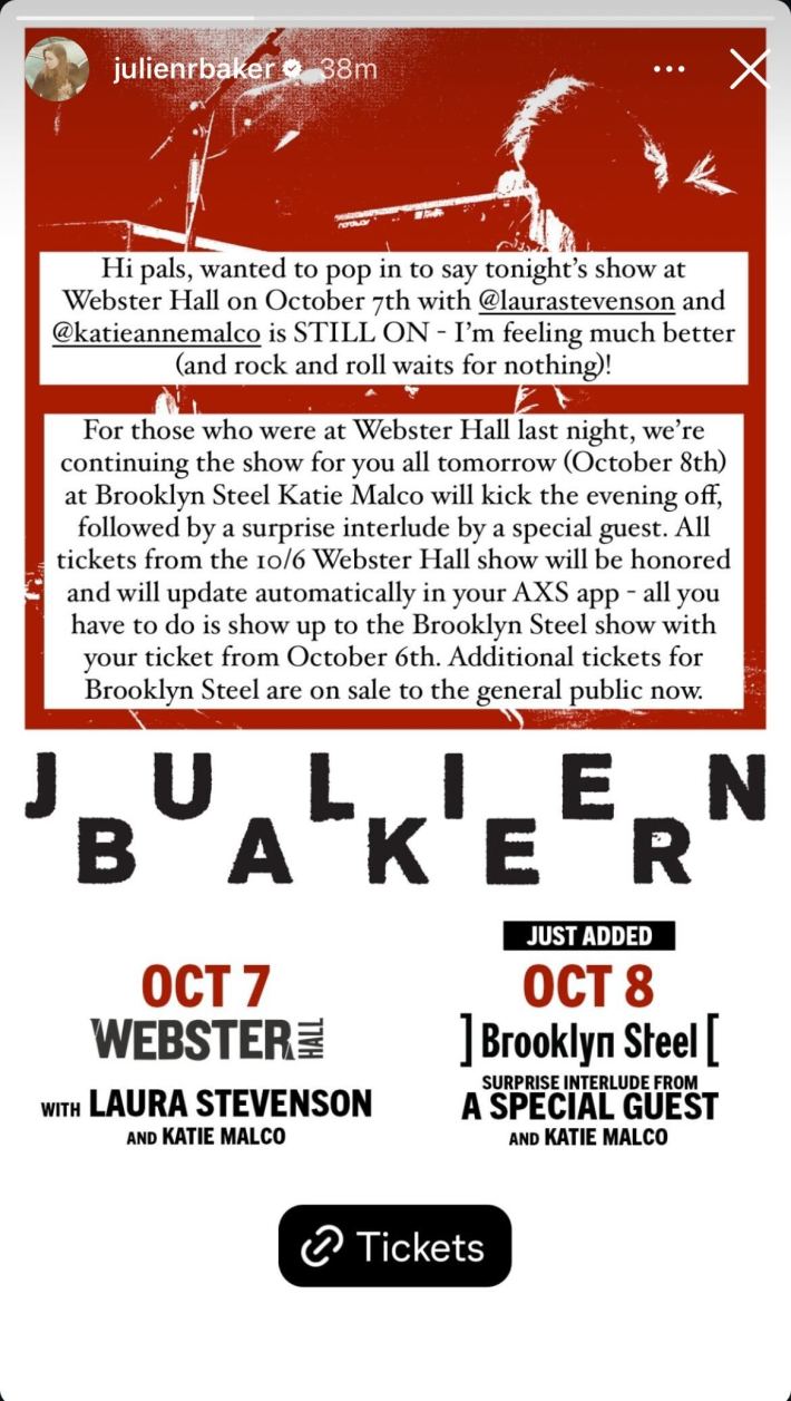 UPDATE: Baker confirmed that tonight's Webster Hall show is still on; in addition, she added an Oct. 8 show at the Brooklyn Steel, for which Sunday tickets will be honored and a "surprise interlude by a special guest" will happen, according to Baker's Instagram Story. See her announcement below.