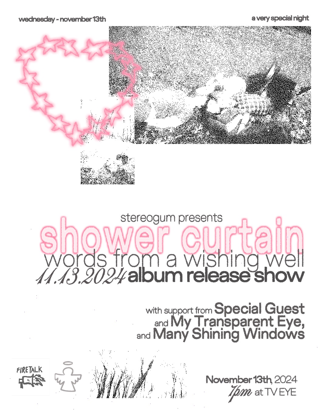 Earlier this month, Stereogum presented fantasy of a broken heart's album release show for Feats Of Engineering at Brooklyn's Baby's All Right, and it was a great time. Now, we're doing the same for Shower Curtain, who are celebrating their fantastic debut full-length words from a wishing well in Ridgewood, Queens at TV Eye on Nov. 13 with My Transparent Eye, Many Shining Windows, and a (very) special guest.