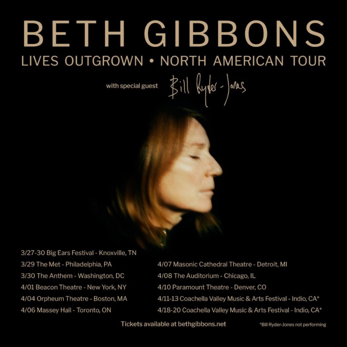 As a member of Portishead, Beth Gibbons hasn't toured North America since 2011; as a solo artist, she hasn't toured North America ever. But a couple of months ago, it was announced that she'd be playing Big Ears Festival in Tennessee in March, marking her first ever solo show stateside. Now, she's announced a tour of solo US gigs (with one in Canada) for this spring, promoting her Mercury Prize-nominated solo debut album Lives Outgrown.