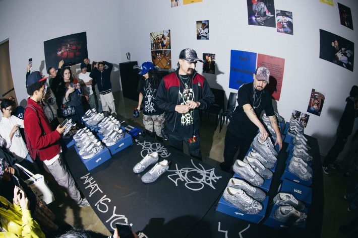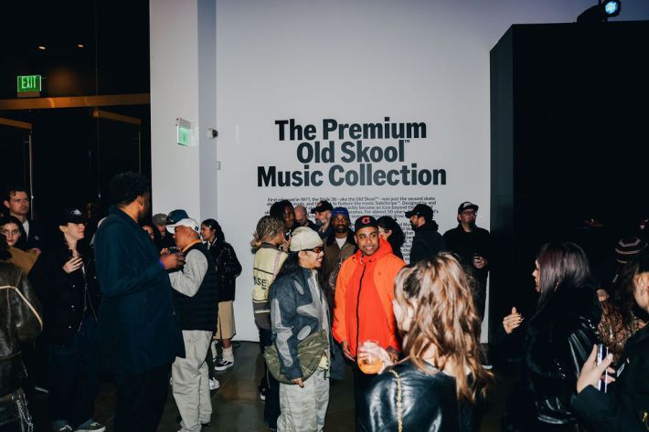 Vans Archivist Catherine Acosta invited us to tour the exhibition, debuting the Premium Old Skool Music Collection. The wall adjacent to the entrance was draped with prints and colors representing different eras of the Old Skool sneaker. We took in the display of the new ‘70s-’80s Punk Capsule (dropping Feb. 6), the ‘90s-2000s Warped Tour-Inspired Capsule (Mar. 6), and the 2010s Hip Hop Capsule (Apr. 10).