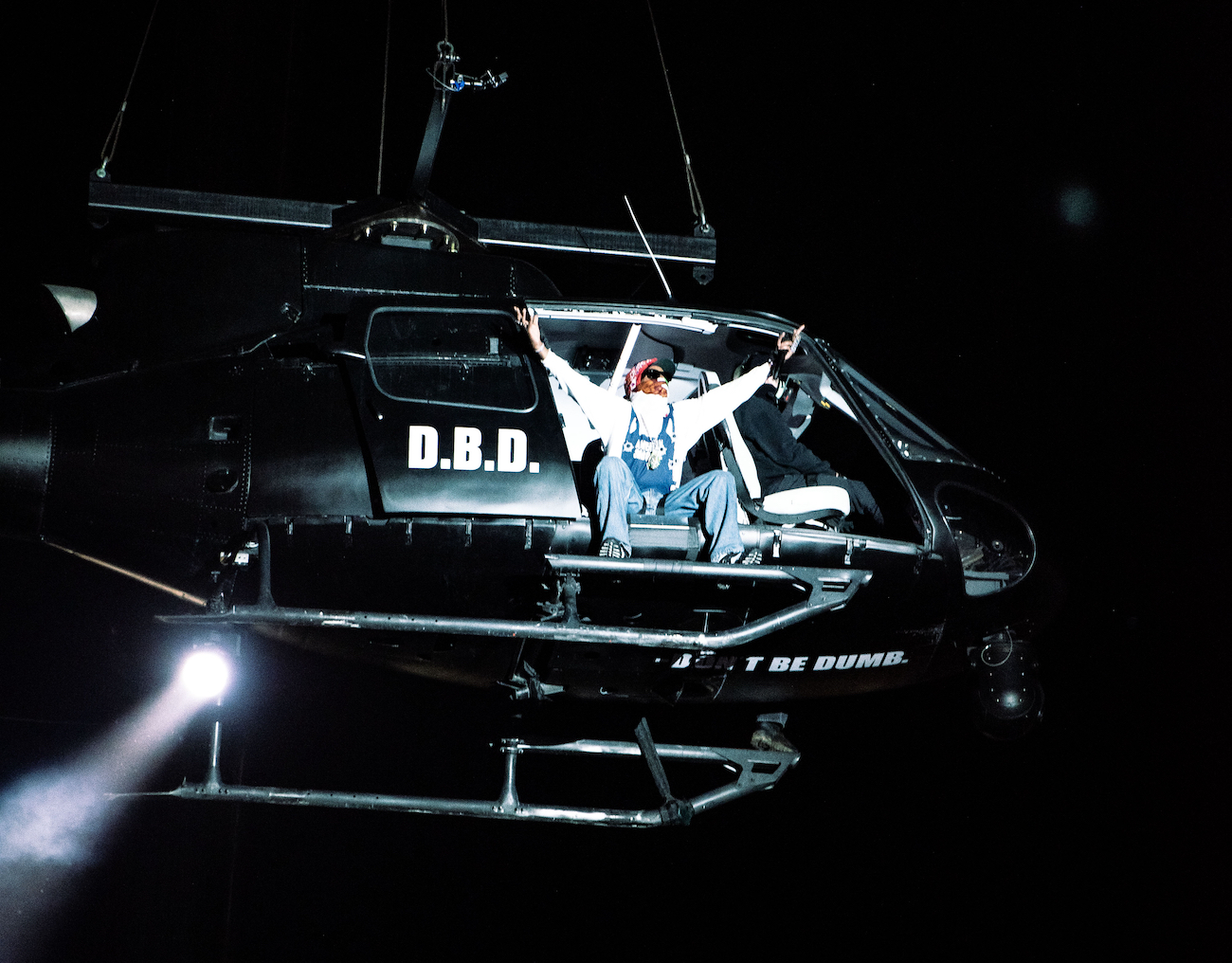 Rolling Loud California is currently underway. Headliner A$AP Rocky performed Saturday night, and he made quite a spectacle out of it, rapping from a helicopter with the words "Don't Be Dumb" on it -- the name of his long-delayed new album -- before being lowered onto the stage. He did some new songs too.