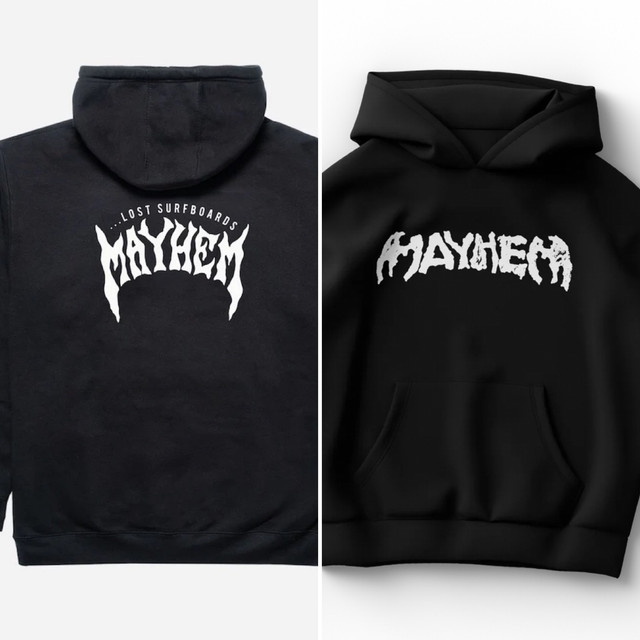 Those do look pretty similar. But here's something funny: Lady Gaga's Mayhem logo doesn't really look anything like the logo of the Norwegian black metal band Mayhem. But the Mayhem Surfboards logo does look a bit like the black metal Mayhem logo, just without the upside-down crosses. In any case, the surviving members of the metal band Mayhem recently did a New York Times interview about their 40th anniversary, and they didn't mention Lady Gaga.
