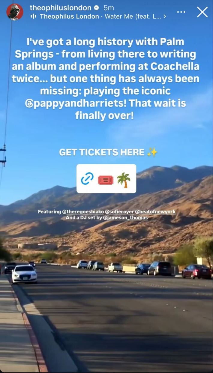 In a new IG post today, he has announced his first live show since disappearing. It'll be this coming Thursday, April 10 at Pappy & Harriet's in the Southern California desert. According to London's post, Sofie Royer and Biako will open. He adds on his story, "I've got a long history with Palm Springs - from living there to writing an album and performing at Coachella twice... but one thing has always been missing: playing the iconic @pappyandharriets! That wait is finally over!"