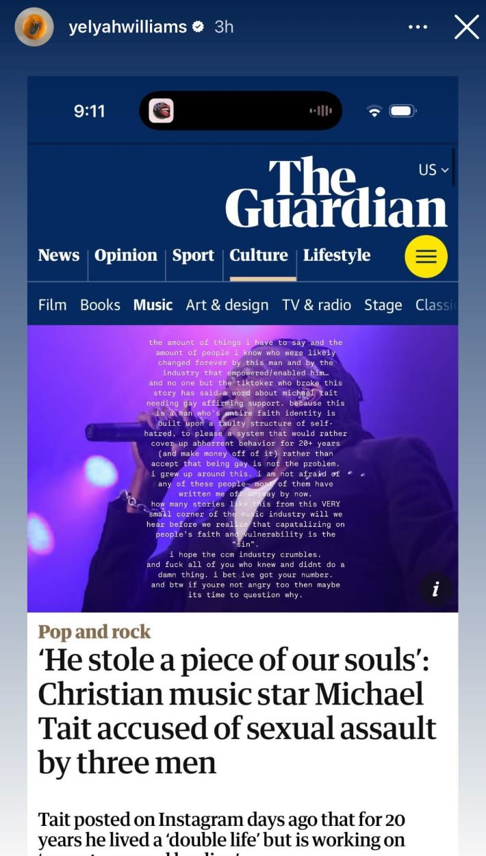 Today The Guardian has another report on Tait's misconduct, which describes his abuse and excessive drug use as "the biggest open secret in Christian music." In the Guardian piece, two of Tait's three alleged victims say they believe he drugged them, while four more men describe "inappropriate behavior such as unwanted touching and sexual advances." Shawn Davis, one of the men who says Tait drugged him, tells The Guardian, "This man destroyed my life."