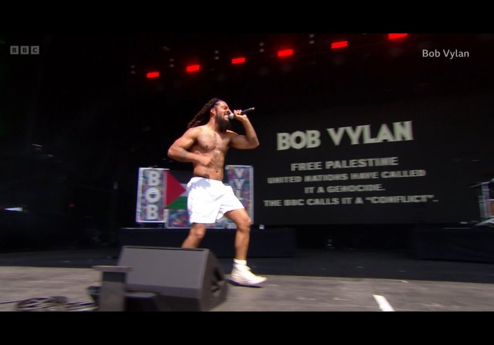 The British punk/grime act Bob Vylan performed right before Kneecap, opening with a message of support for the group and criticism of those who tried to get them censored. The duo's Bobby Vylan led “Free Palestine” and “Death to the IDF” chants, which were broadcast on the livestream. Afterwards BBC said those comments were “deeply offensive” and that the set would not be viewable on-demand.