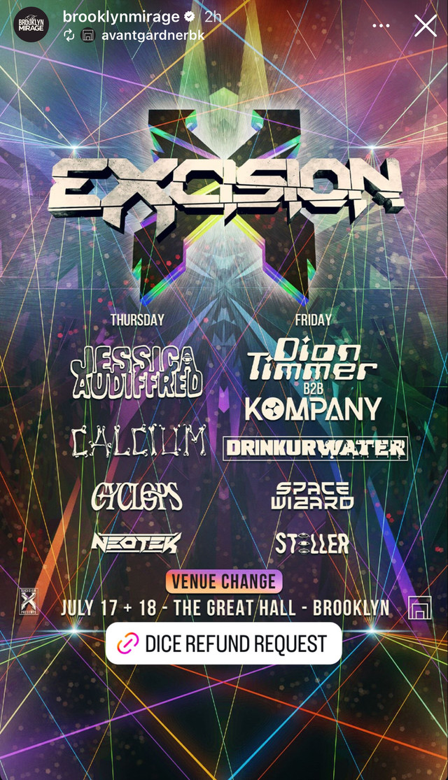 Today, Excision's sold-out shows for July 17 and 18 were moved to The Great Hall, another Avant Gardner venue, which has half the capacity (3,000 standing, whereas Brooklyn Mirage is 6,300.) That should be interesting.