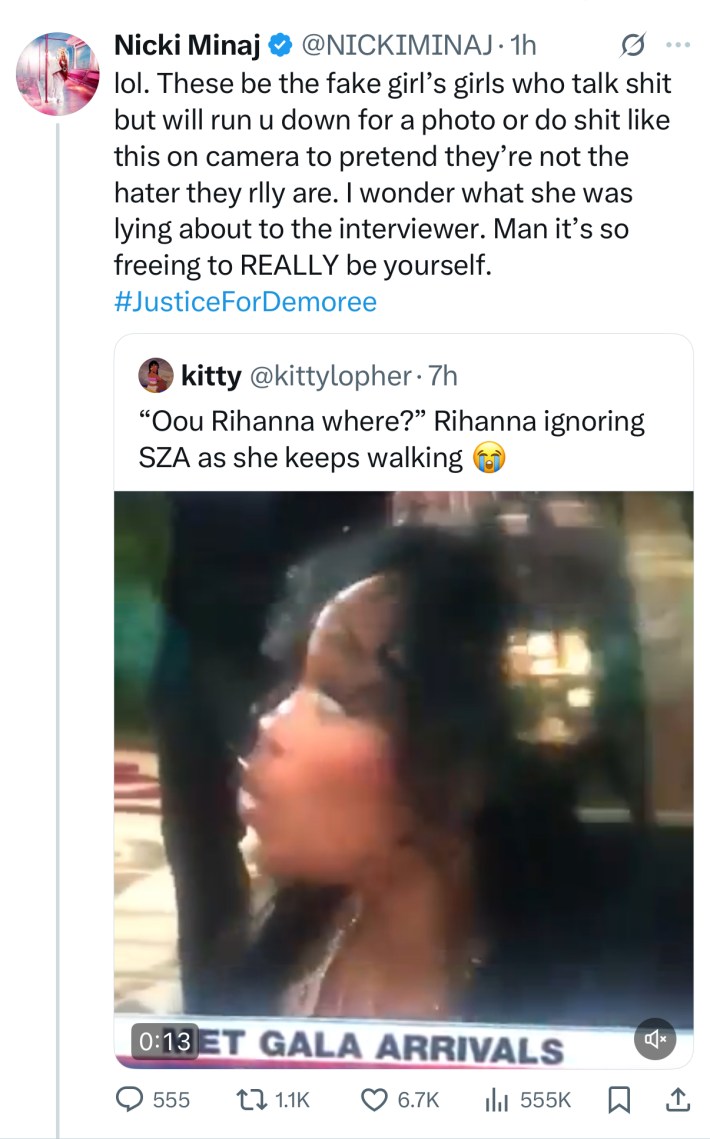 Today's drama seemingly started with beef between SZA's manager Punch, who's also the president of Top Dawg Entertainment (TDE). Minaj posted: "Tiny Dick Executive." Shortly after, SZA tweeted: "Mercury retrograde .. don’t take the bait lol silly goose ." Though the post was vague, Minaj went straight in, quote-tweeting, "Go draw your freckles back on bookie #JusticeForDemoree #DepositionPerez Liar liar pants on fire. Sounding like a fkng dead dog." SZA replied: "I don’t give a fuck bout none of that weird shit you popping ." Minaj later added, "Shutup ugly."