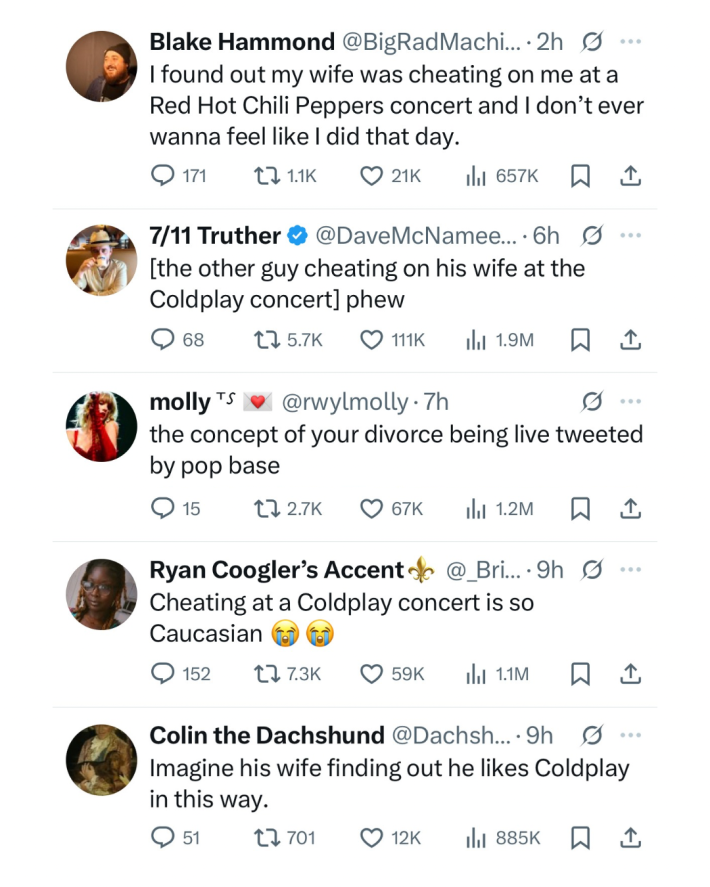 Did you know that Coldplay's current live show has a whole kiss-cam segment, like an NBA game? During Coldplay's live show, stadium screens apparently show unsuspecting couples in the crowd, and then Chris Martin urges them to kiss. I didn't know that. Neither, apparently, did Andy Byron, CEO of the tech platform Astronomer, which is reportedly valued at $1.3 billion. At a recent Coldplay gig in Boston, Coldplay's kiss-cam caught Byron all snuggled up with a woman who is not his wife, and that video quickly went viral.