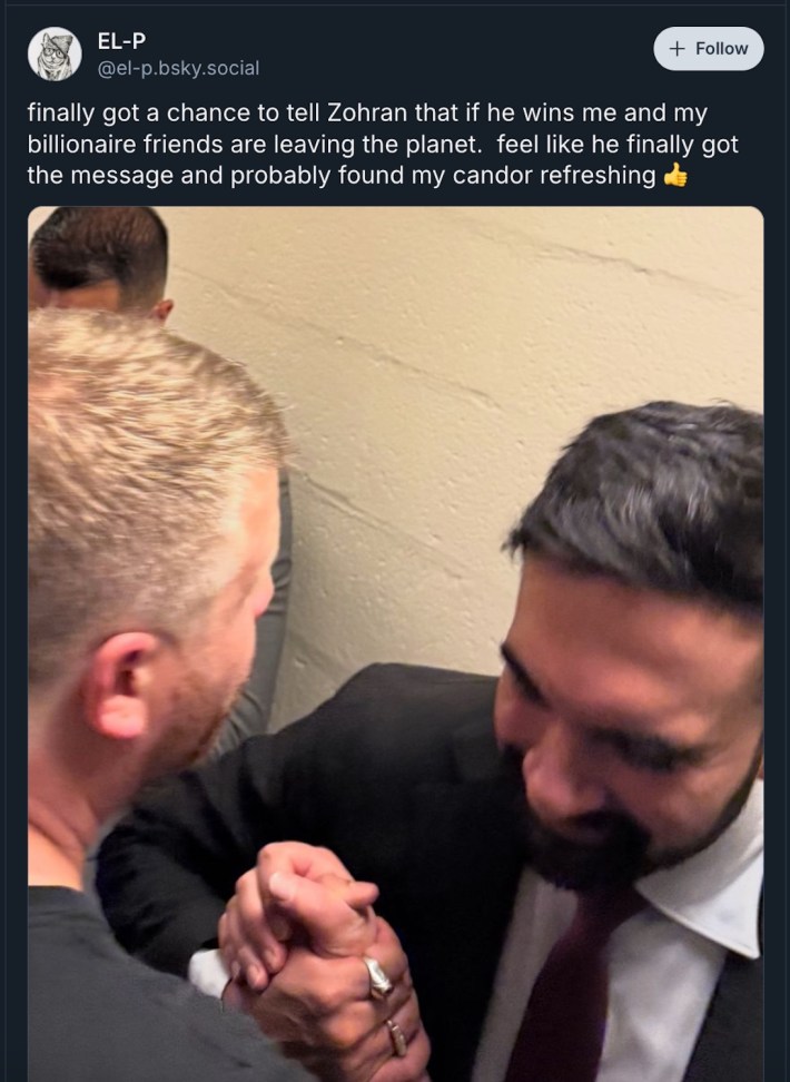 NYC Democratic nominee for mayor Zohran Mamdani was also at the show, but he sadly didn't perform any of his old Mr. Cardamom songs. But he did meet RZA and El-P backstage, just hours after hanging out with Bernie Sanders: