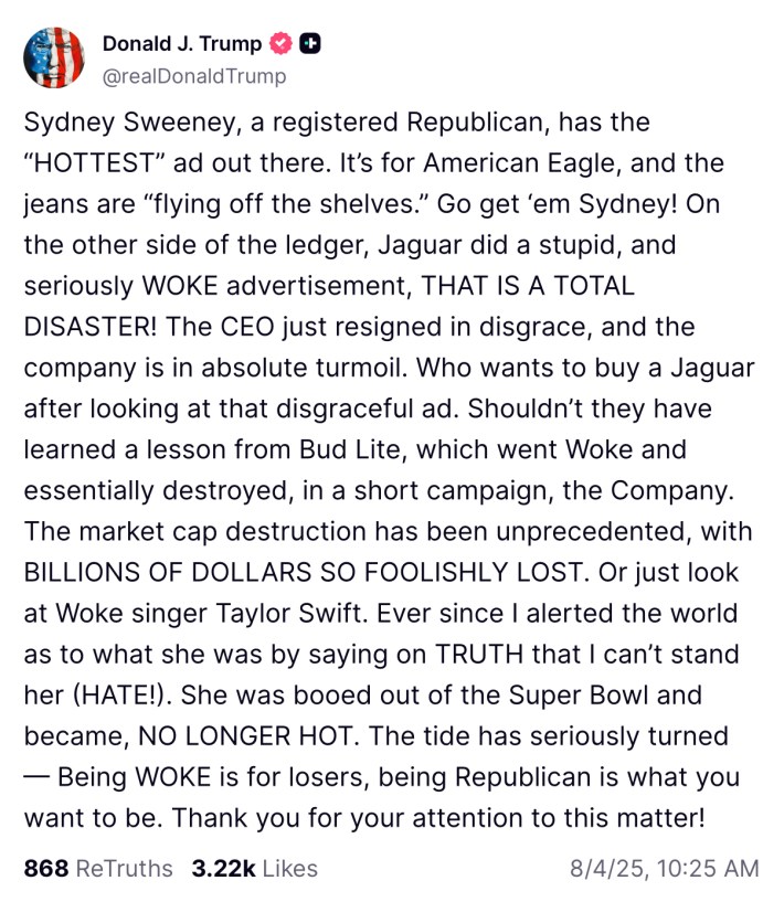 The jeans/genes wordplay and the casting of Sweeney, a preferred sex symbol of the MAGA crowd, led some to interpret the commercial as a winking reference to eugenics, the discredited theory that humanity can be improved through selective breeding for certain traits. This sparked backlash from some progressives, who compared the spot to Nazi propaganda. This in turn led conservative outlets like Fox News to devote extensive airtime to mocking the allegedly over-the-top woke response to the ad; former Fox anchor Megyn Kelly, now a SiriusXM personality, described it as a "leftist meltdown." Charlie Warzel wrote a smart piece for The Atlantic this week about the saga and how it illustrates the dysfunctional way discourse functions nowadays: