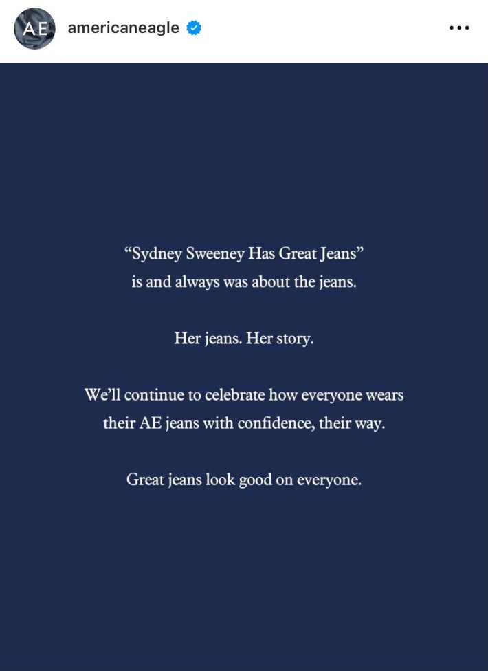 Good lord, I guess I have to summarize this latest Sydney Sweeney ordeal. Sweeney, the actress who has become a culture war touchpoint because some conservatives decided her buxom figure represents the end of woke, appears in a new ad campaign for American Eagle jeans called "Sydney Sweeney Has Great Jeans." In one short commercial from the campaign, the camera traces across the figure of a denim-clad, reclining Sweeney as delivers this monologue: "Genes are passed down from parents to offspring, often determining traits like hair color, personality, and even eye color." When the camera reaches her face, she pauses, then says, "My jeans are blue."