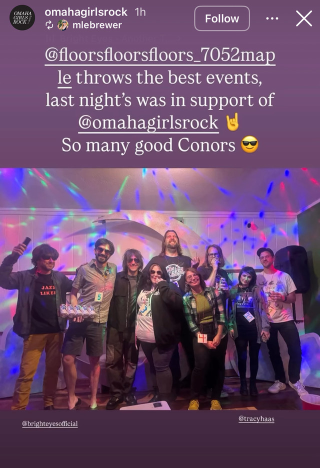 The event was a benefit for the music education organization Omaha Girls Rock. The entrants each received an American Spirit cigarette and sang karaoke together. No one was expecting Oberst's arrival, and he brought a garbage bag of his old clothes to gift to the lucky winner. “I was cleaning out my closet so you get a big bag of my clothing,” he said. Oberst’s bandmate Mike Mogis competed too, but did not win.