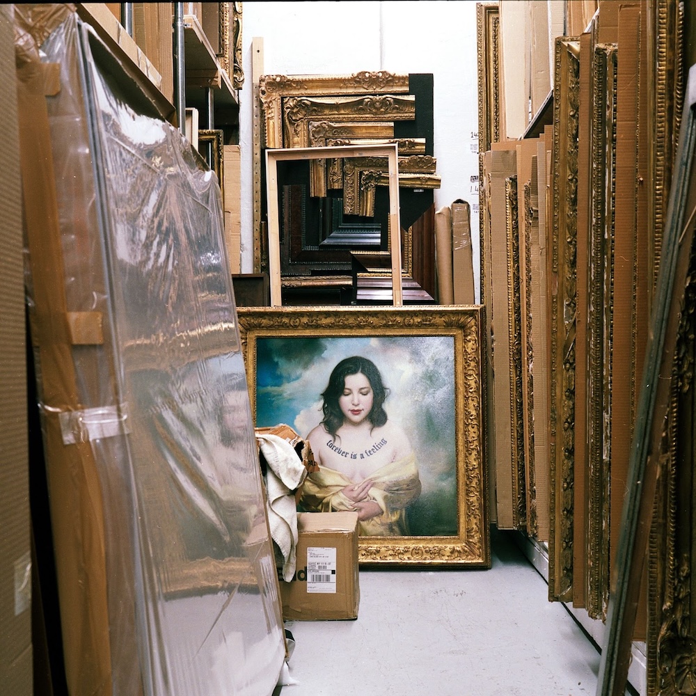 Previously, the cover of Forever Is A Feeling was a painting of Lucy Dacus by Will St. John. That portrait still appears in the new cover art, but it's a photo of the portrait in storage, taken by Jon Henry. On Twitter, Dacus explains that the photo of the portrait was what she first intended to use as the cover: "thank you to Jon Henry for helping me see my original idea for the cover of Forever Is A Feeling- from here on, I’m changing the album art to this because… I want to and I can! lol"