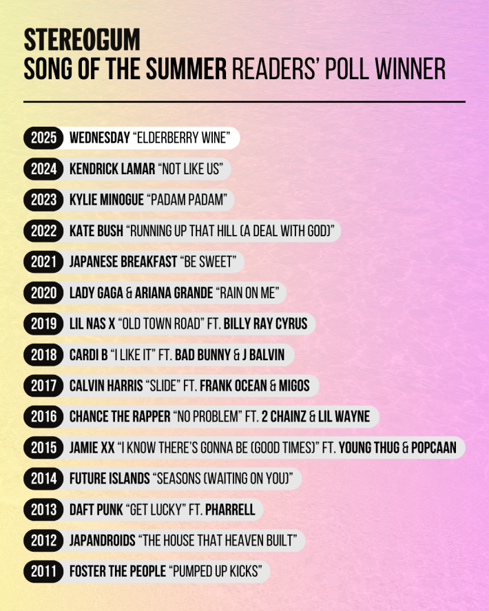 Over the past week, you, the readers of Stereogum, have cast your votes to determine this year's Song Of The Summer — and if I may say so, you have voted well. Today, we're ready to reveal the results of the poll. Check out the top 10, and a graphic listing our past 15 years of winning tracks, below.