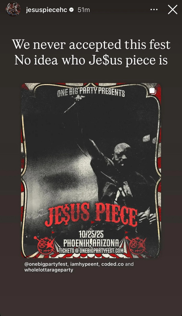 The three released their statement 20 minutes after Heard reshared a month-old post for the October festival One Big Party in Phoenix that features “JE$US PIECE” on the lineup, writing “that’s me and the homies.” (Heard's IG bio is now "Proud papa & vocals for JE$US PIECE.") In their own IG Story yesterday, Jesus Piece wrote, “We never accepted this fest No idea who Je$us piece is."