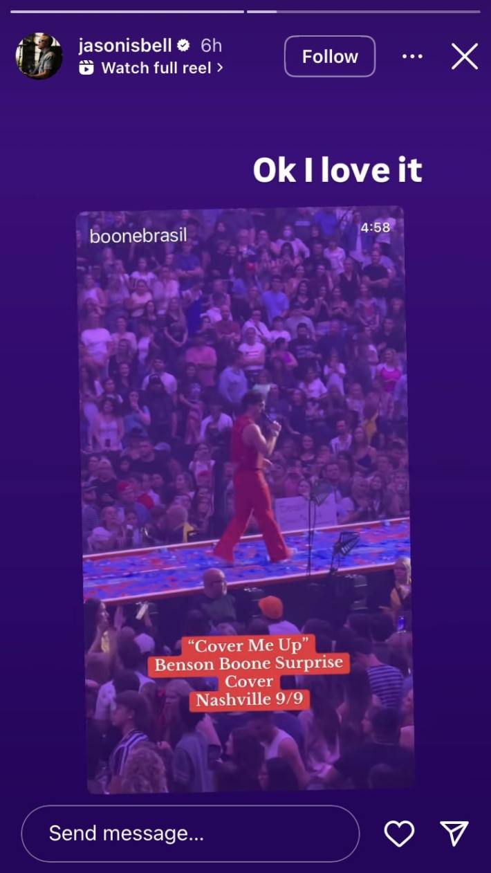 Throughout his tour supporting new album American Heart, backflip expert and symbolism factory foreman Benson Boone has been covering a different song each night. Tuesday he was in Nashville headlining Bridgestone Arena, so he picked a country song to perform. That song was "Cover Me Up," and, as commenter figgsrock points out, Isbell endorsed the performance on his Instagram story: "Ok I love it."