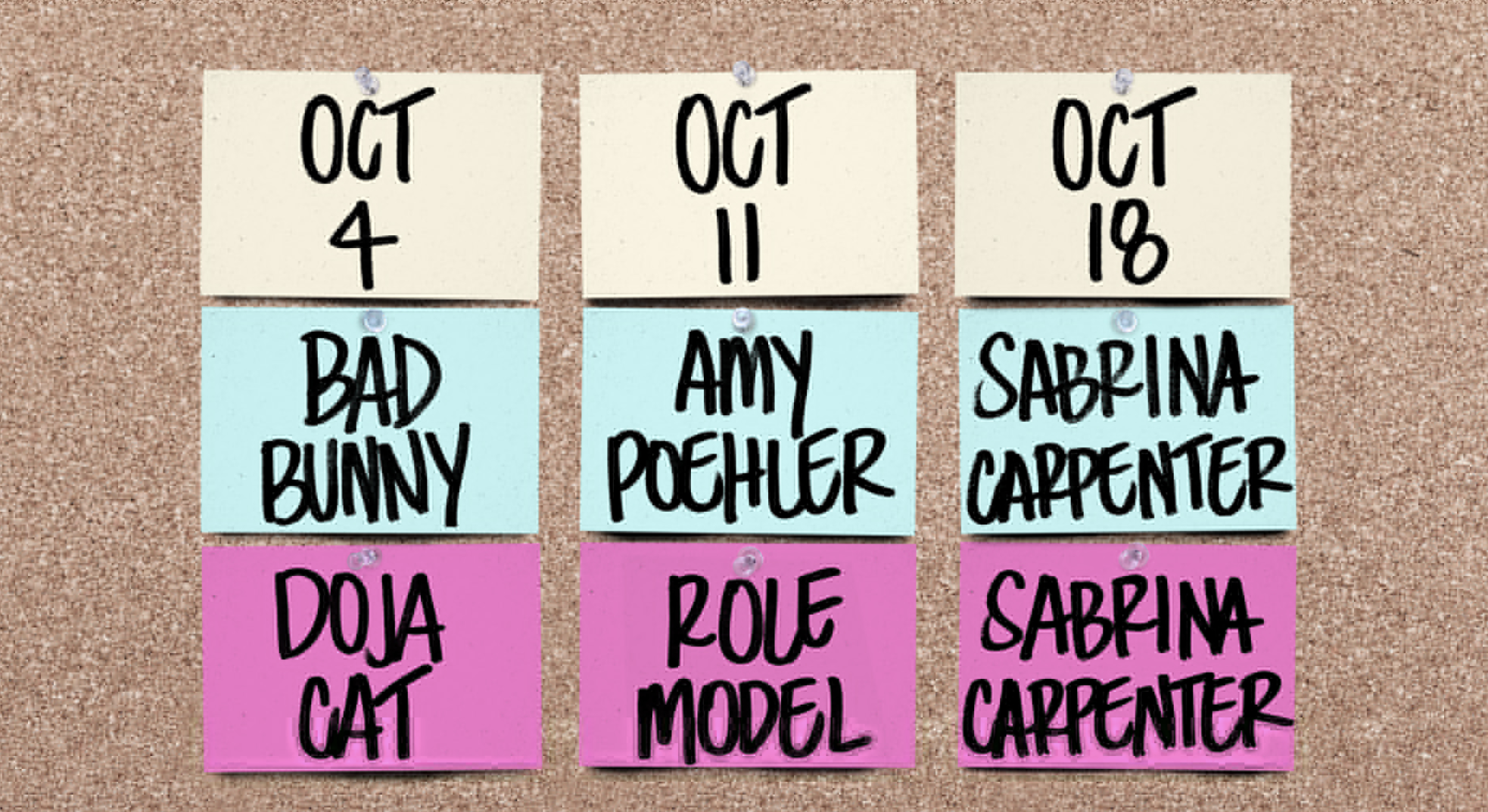 On Oct. 4, the week following the release of her new album Vie, Doja Cat will perform and longtime SNL pal Bad Bunny — who is not touring in the US right now due to fear of his fans being targeted in ICE raids — will host. Role Model will perform on Oct. 11 with host Amy Poehler, and, on Oct. 18, Sabrina Carpenter, who is quickly becoming an SNL fixture, will do double duty as both musical guest and host.