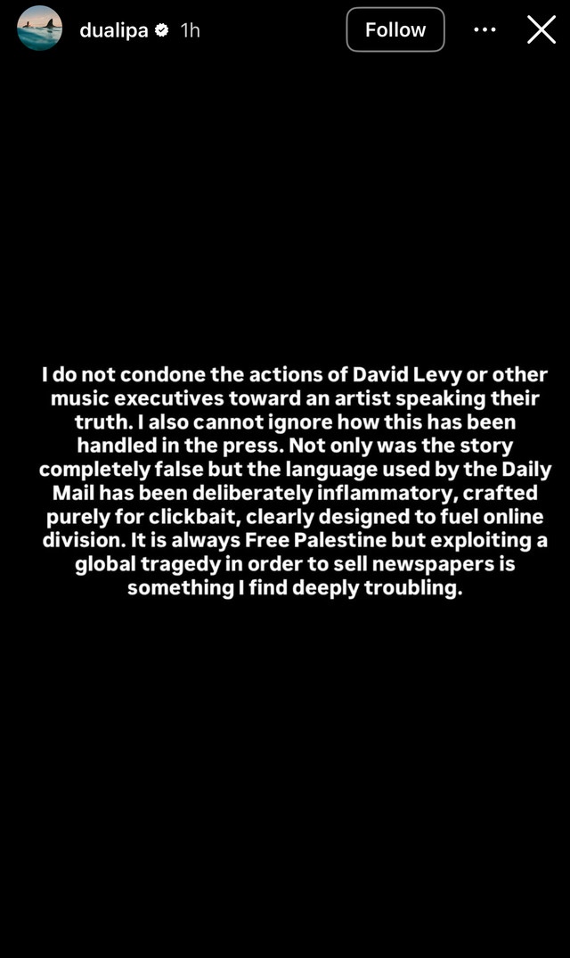In an Instagram story, Lipa criticizes Levy but also the media's handling of the story. She says the idea that she fired him over his pro-Israel, anti-Palestine advocacy is "completely false." Here's the full text of her message:
