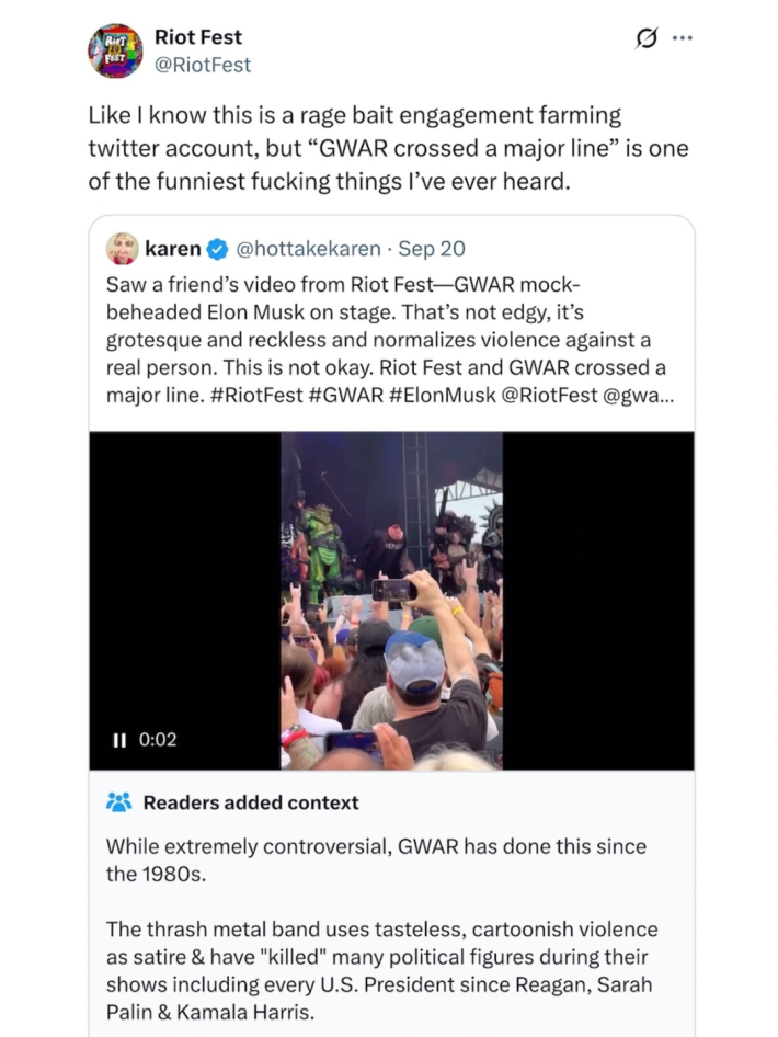Like I know this is a rage bait engagement farming twitter account, but “GWAR crossed a major line” is one of the funniest fucking things I’ve ever heard. https://t.co/lGIamyKnSi