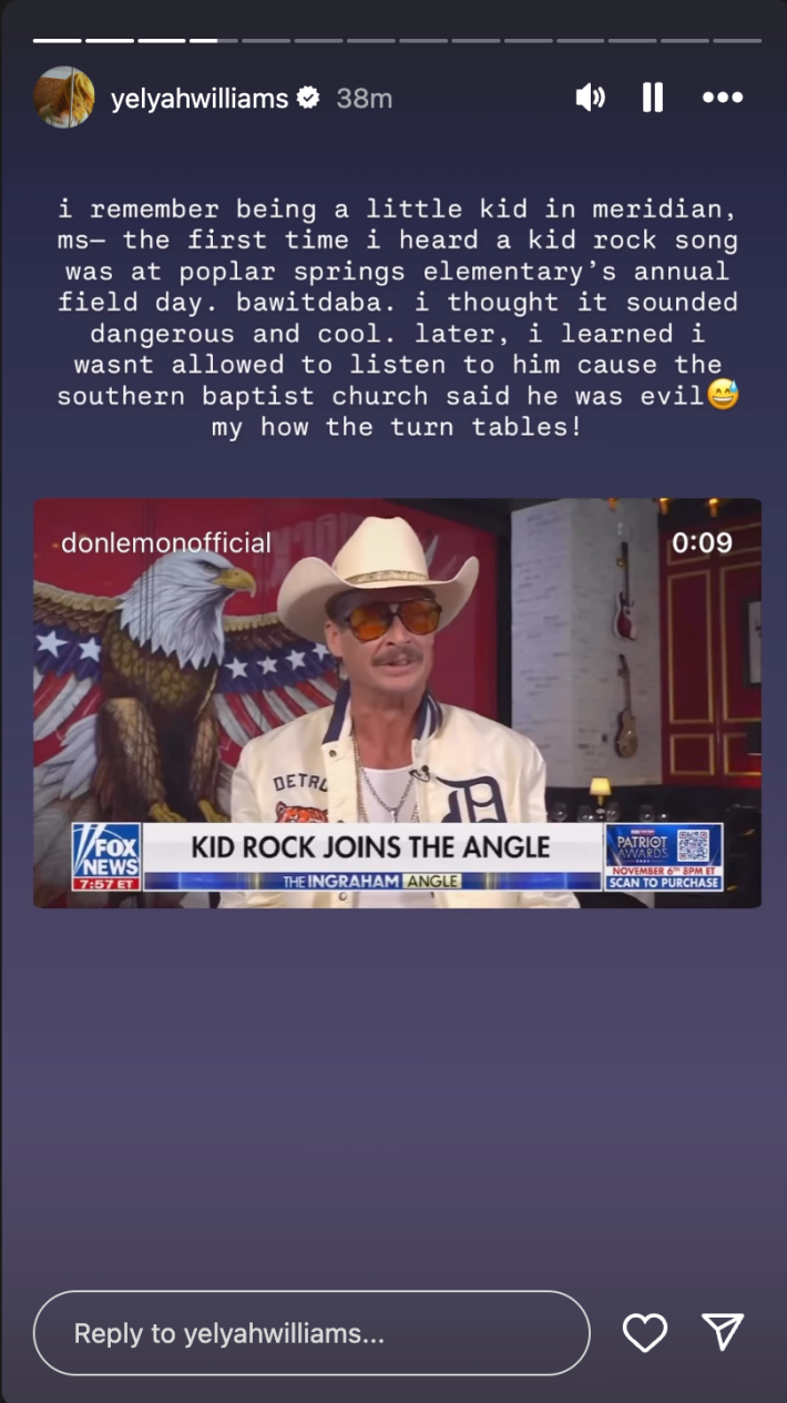 Williams shared the clip on her Instagram Story with a response: "i remember being a little kid in meridian, ms- the first time i heard a kid rock song was at poplar springs elementary's annual field day. bawitdaba. i thought it sounded dangerous and cool. later, i learned i wasnt allowed to listen to him cause the southern baptist church said he was evil. my how the turn tables!"