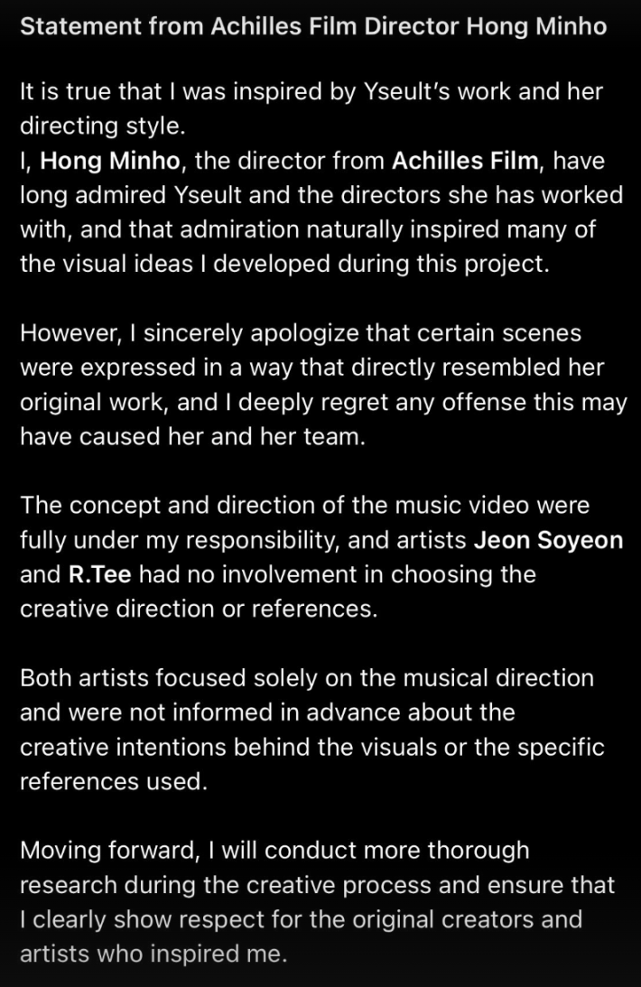Following Yseult's posts, director Hong Minho (Achilles) released a statement on social media, admitting that he was directly inspired by Yseult and the directors she worked with. He also specified that R.Tee and Soyeon had "no involvement in choosing the creative direction or references." His full statement reads: