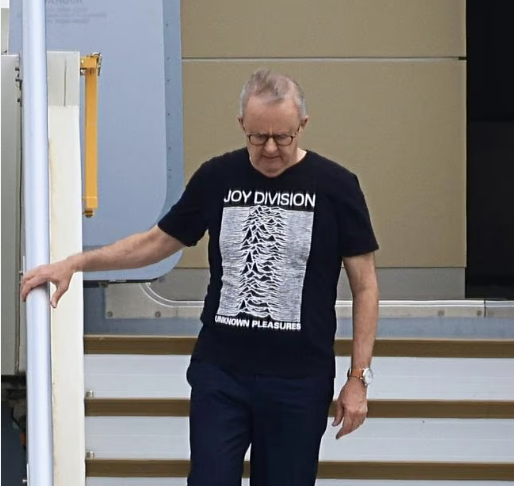 The biggest story in Australian politics this week has involved the Prime Minister wearing a Joy Division T-shirt. On Oct. 23, Prime Minister Anthony Albanese, of the center-left Labor Party, was filmed and photographed exiting his plane wearing a tee with the cover art from 1979's Unknown Pleasures rather than the customary suit and tie. Five days later, Sussan Ley, leader of the conservative Liberal Party (confusing!) criticized Albanese for wearing the shirt in a speech before parliament. Describing Albanese's sartorial choice as a "profound failure of judgment," Ley attempted to frame Joy Division as antisemitic because the band is named after "a wing of a Nazi concentration camp where Jewish women were forced into sexual slavery."