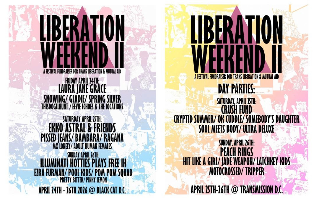 The second Liberation Weekend goes down 4/24-26 at the Black Cat, a local institution, and at Transmission, a new venue on the site of the former Rock N Roll Hotel. Proceeds will go to the trans aid organizations Gender Liberation Movement and No More Dysphoria. Ekko Astral, a 2024 Stereogum Band To Watch with a new album in the works, will headline one of the nights alongside "friends." The other two headliners are punk legend Laura Jane Grace and Illuminati Hotties, who will play their 2020 album Free I.H. in full.