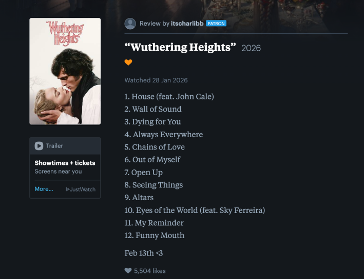 Wuthering Heights opens in theaters 2/13. The soundtrack album comes out the same day on Atlantic.