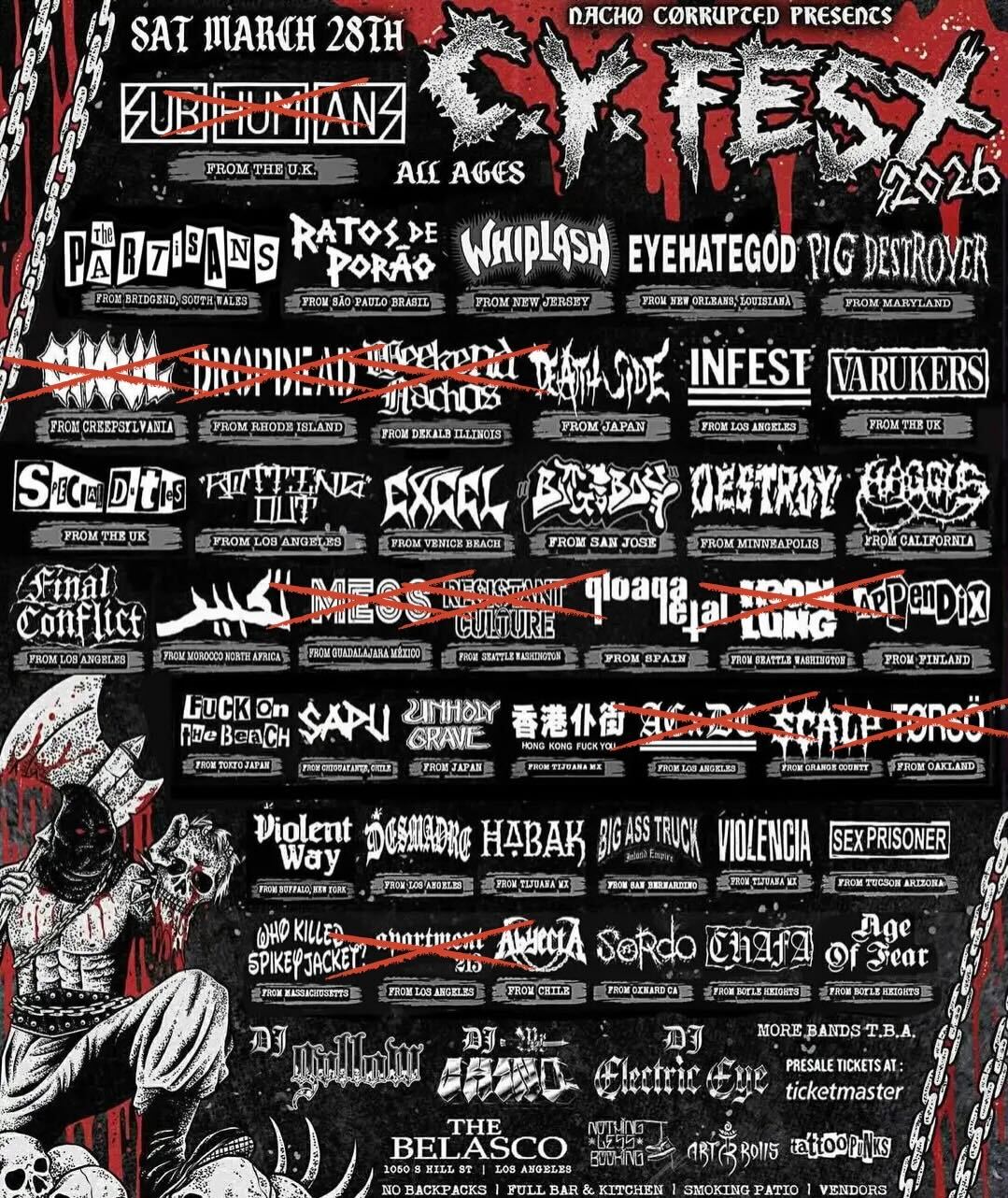 Since then, more bands have announced that they won't play the fest, including the planned headliners, reunited UK punk legends the Subhumans. Ghoul, Dropdead, Weekend Nachos, Mess, Resistant Culture, ACxDC, Triste, Antichrist Demoncore, Haggus, Hong Kong Fuck You, Bomber, and Hell Fire have also dropped. (Some of these acts were billed for a pre-fest event.)