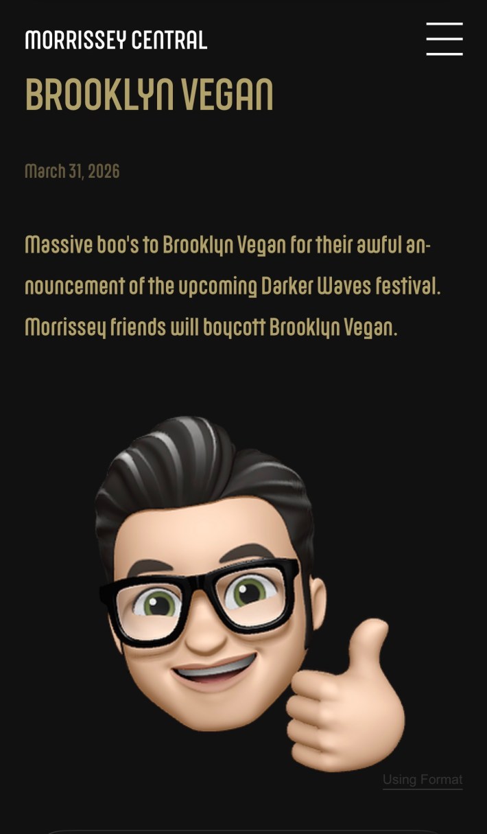 In 2023, the inaugural edition of Darker Waves, a festival dedicated to new wave nostalgia, came to Huntington Beach, California. New Order and Tears For Fears headlined a single-day bill full of '80s synthpop greats and their spiritual successors. Our buddy Ryan Leas reviewed the show for Stereogum, and he seemed to have a great time. There hasn't been another Darker Waves since then. But three years later, the festival is coming back, and it's got two supremely chill headliners: Morrissey and Smashing Pumpkins. What could possibly go wrong?