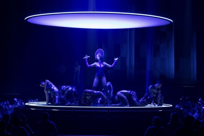 For the most part, Mother Mary seems like a slightly tonier version of recent fictional gothic-cinema pop stars — Lady Raven from Trap, Skye Riley from Smile 2, Jocelyn from The Idol, Celeste from Vox Lux. (August Moon, the very funny fake One Direction from the previous Anne Hathaway joint The Idea Of You, do not belong to this canon.) Plausibility isn't the point of Mother Mary, but Mother Mary herself, with her futuristic lighting and her architectural stage design, is a more plausible pop star than most of her fictional peers. Hathaway has the alien charisma to play just such a figure. In the scene where she sings the soundtrack song "Holy Spirit 2," I got just a hint of the charge that I get at actual arena-level pop shows.