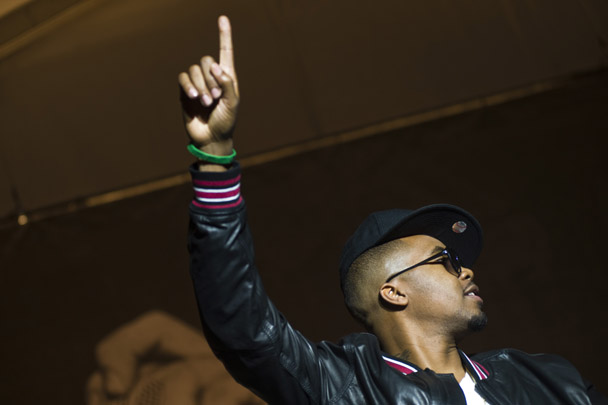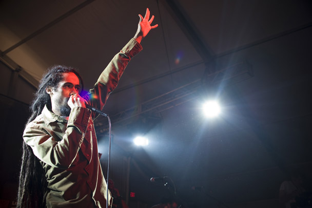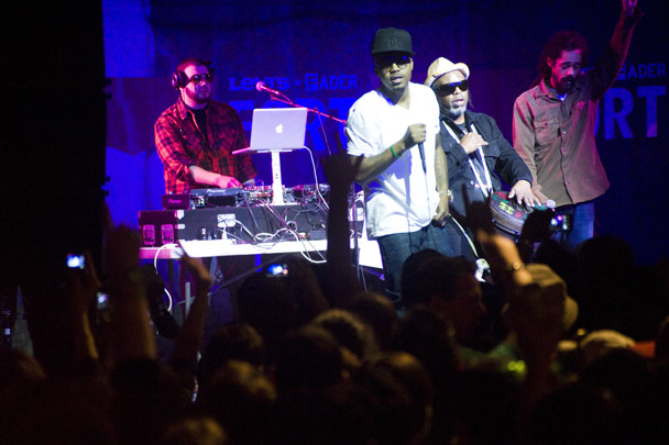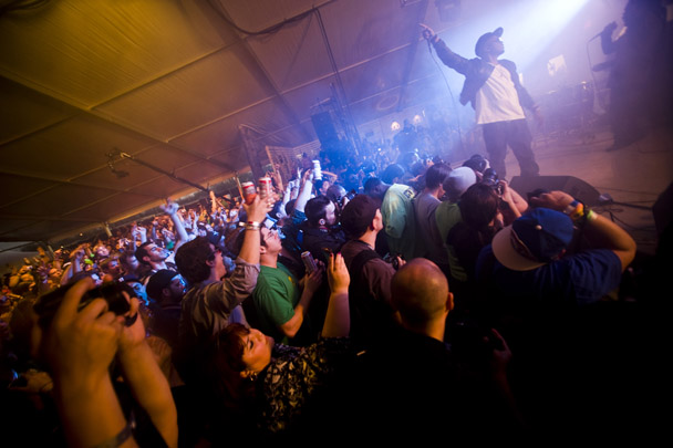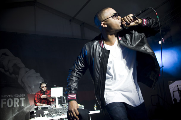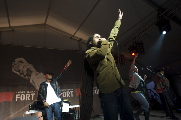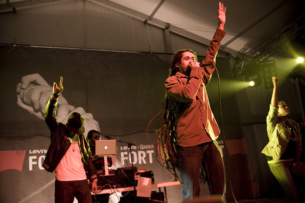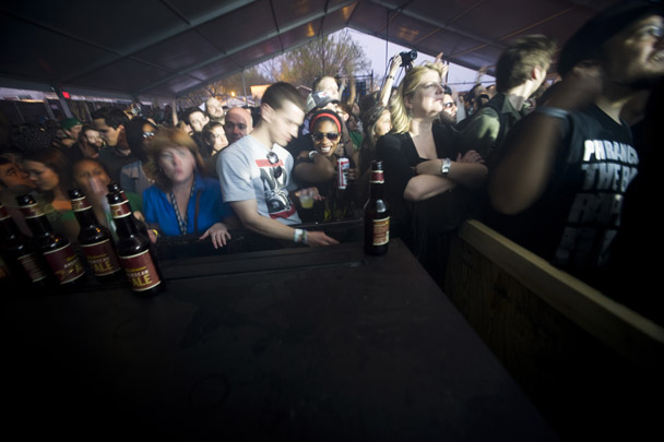 The party from local news site Austinist featured a triptych, with tourmates Washed Outand Small Black playing (separately and together, as previously documented) just moments after a superb indoor set from one of the genre's leading lights, Toro Y Moi -- the room was packed to the gills, but they were very chill gills. As always Levi's/FADER is holding down their Fort, a compound located a ten minute walk from the main drag of 6th St., but worth every step -- free booze and a lineup that will capture most of the year's buzz bands over its three days. No they don't have a petting zoo, but the "surprise guests" got going yesterday with a set from Nas and Damien Marley; rumors for the rest of the week have included everything from Ludacris to Black Eyed Peas (slammy). (Also, Sleigh Bells + Bone Thugs-n-Harmony should prove pretty unfuckwithable.)