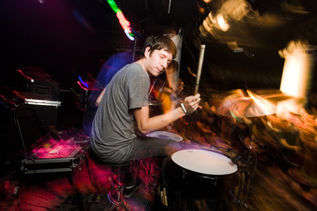 Last night we finally hit Andrew W.K.'s recently opened venue. Nice space, clearly designed with acoustics in mind -- huge speaker blocks above the side bar, tweeters suspended over the floor for sound to surround -- although you couldn't say the same for sight (the poles that dot the space are good for advertising, not so good for uninterrupted stage views). Anyway it's solid to see a worthy music space opening in Manhattan, and it's always great to see three bands for the price of free in Manhattan. This was the first of four shows No Age is doing to help shockhound.com celebrate their launch, last night including ex-Black Dice man Soft Circle and raucous NJ crew Titus Andronicus in support. Unfortunately we missed the Circle set, but Titus, Dean and Randy did their best to inject some life into a pretty tame Sunday night crowd. For Andronicus that meant a three-guitar attack on a stage that could barely contain them, and for No Age that meant a switched up setlist, no Randy-on-the-amp bit, and a single guitar that seemed more forceful than the Andronici combined. The guys may have seemed a little weary, but we all were. At least No Age have the excuse of nonstop touring. If you want more, enjoy this spread of photos for your eyeballs, all by photog Ben Shapiro.