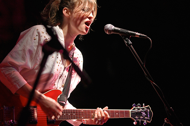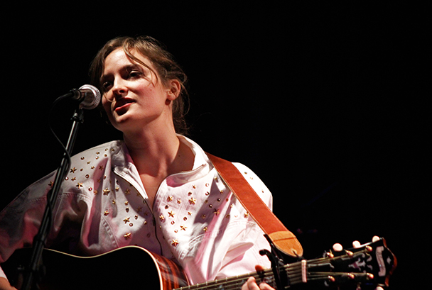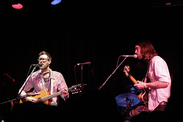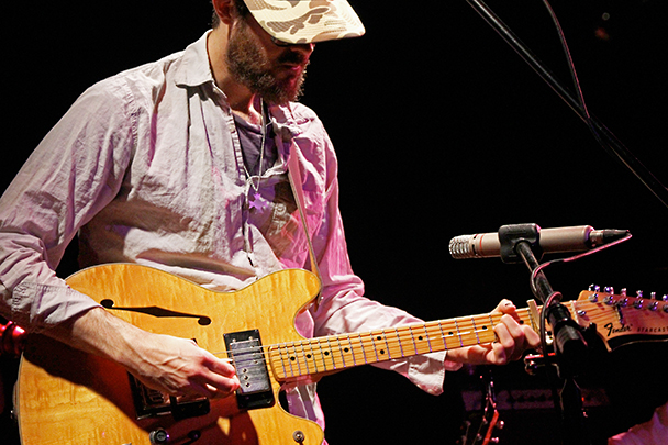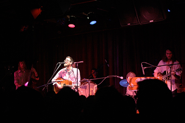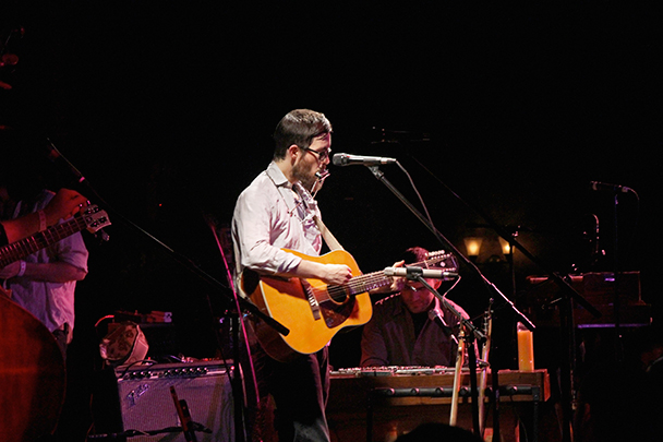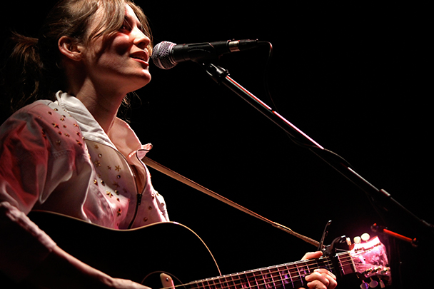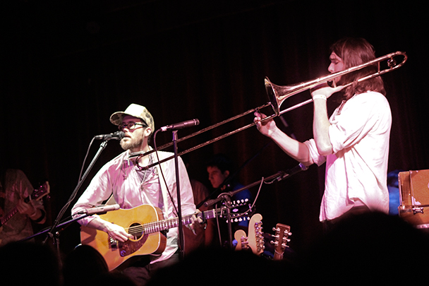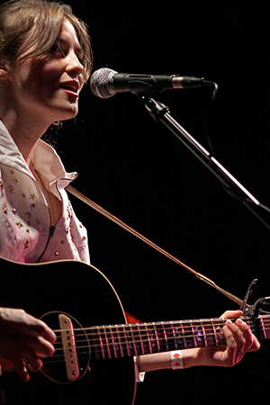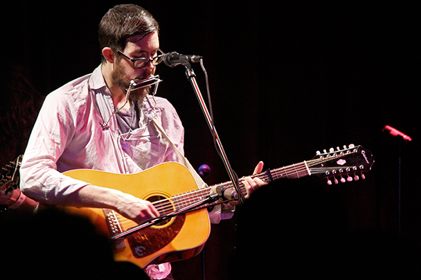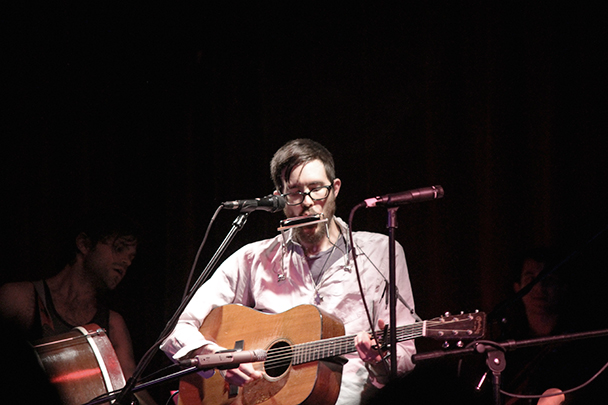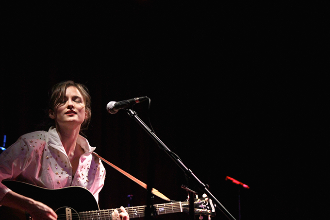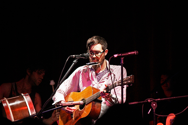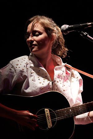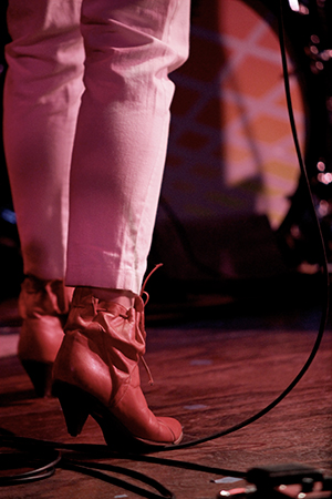 The last time we brought you photos from an Elvis Perkins show was in December at the Bowery Ballroom during a stretch of particularly grey weather. This weekend things were sunnier, despite a few clouds and people still singing about "Doomsday." Perkins has grown out his beard and added camo to his increasingly countrified ensemble. Otherwise, he showed up to the Bell House in usual form (complete with horns). Speaking of country western get-ups: Friday's opener, the Brooklyn-via-Kentucky country-folk songwriter Dawn Landes took the Elvis thing seriously and came decked-out in a white rhinestone-lined jumpsuit with Springtime red boots. Our photographer Sean Edgar captured her footwear and various other details.