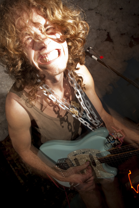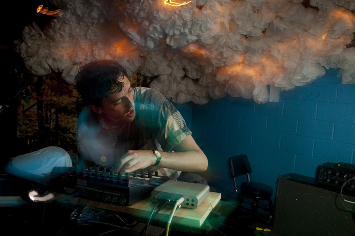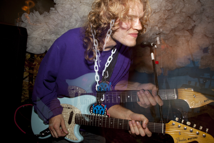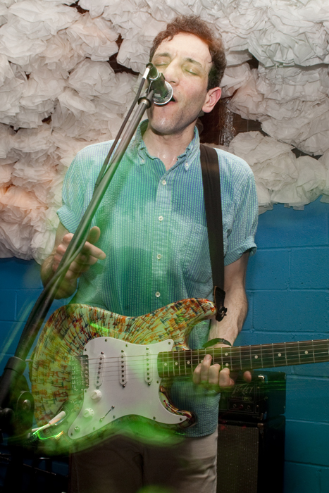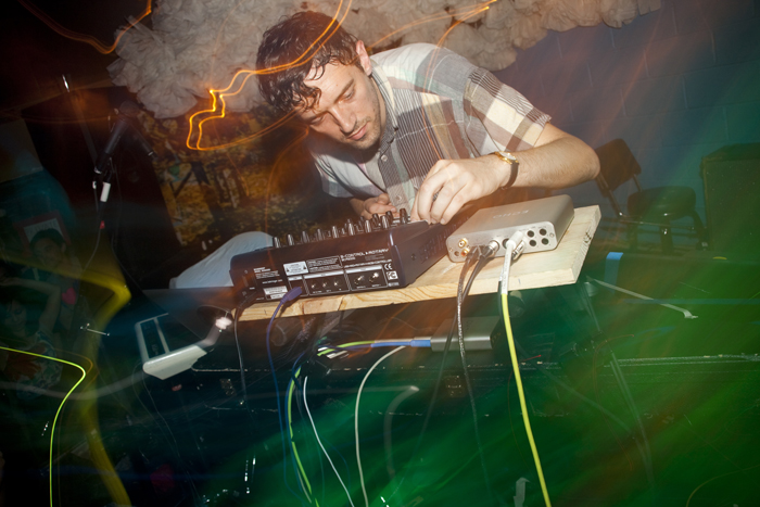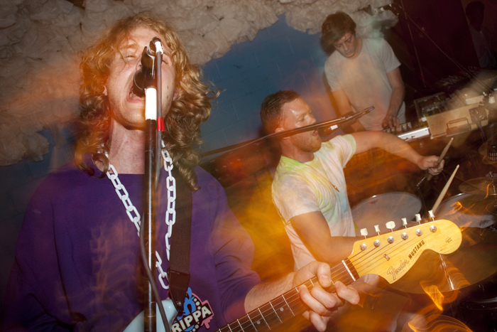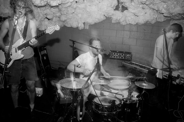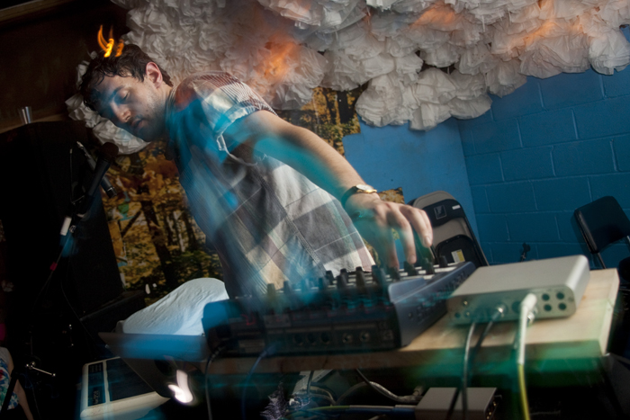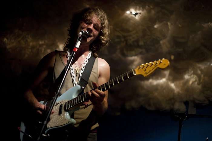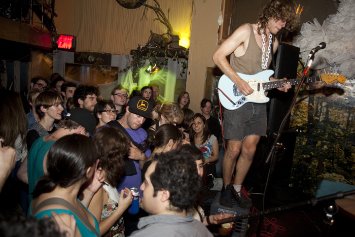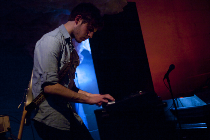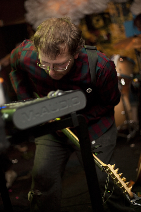 I'd meant to put up these photos by Sean O'Kane yesterday, but Peter Gabriel got in the way (always getting in the way, that guy). So a day late but still worth framing: Williamsburg's Glasslands Gallery, which seems to have stepped up their booking game especially since the folks at PopGun stepped up theirs, assembled a blog-star lineup for their Friday night: Each band in that headline rolled into the Kent Ave. art space with varying degrees of deserved internet accolades, resulting in a 4-hour show worth every minute. There were two out-of-towners (Ontario's swooning female-fronted dream-pop outfit Memoryhouse, and Chicago's more raucous, laptop-stitched indie rock outfit Light Pollution) and three local natives: wild eyed psych-pop trio Keepaway, darkwaving dance trio and Small Black-affiliates Psychobulidings, and the headlining and (somehow increasingly) excellent synth, guitar, and percussion-sampled Ibiza minded party starters of Tanlines.