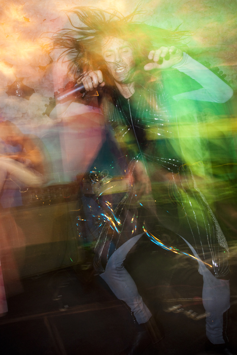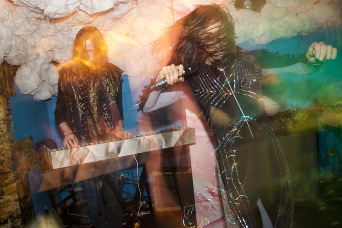 Surprisingly impressed with Psychobuildings, too, whose lineup consists of (nearly literally) balls-out frontman Peter LaBier (rightly credited by the band for "vocals, dancing"), Peter Schuette (keyboard synths), and the prolific and incessantly active Juan Pieczanski, a member of Small Black and the namesake behind the once independent-then-Pitchfork-affiliated web video series Juan's Basement. The first Peter is formerly of the band Precinct, the second also plays in Silk Flowers. According to Juan, he only met Schuette in person when the band posed for a FADER photo shoot -- until then their collaboration and relationship was strictly internet-based. Which made their dynamic set at Glasslands all the more impressive, although in fairness most of the credit their rests with LaBier, whose one-piece black spandex outfit with strategic cutouts, glittery embroidered stripes, and pom-pom'd sleeves was upstaged only by the body dancing inside it. You can see shots of it in the gallery, and if you want to buy it, talk to the dudes at JF And Son; it was custom made.