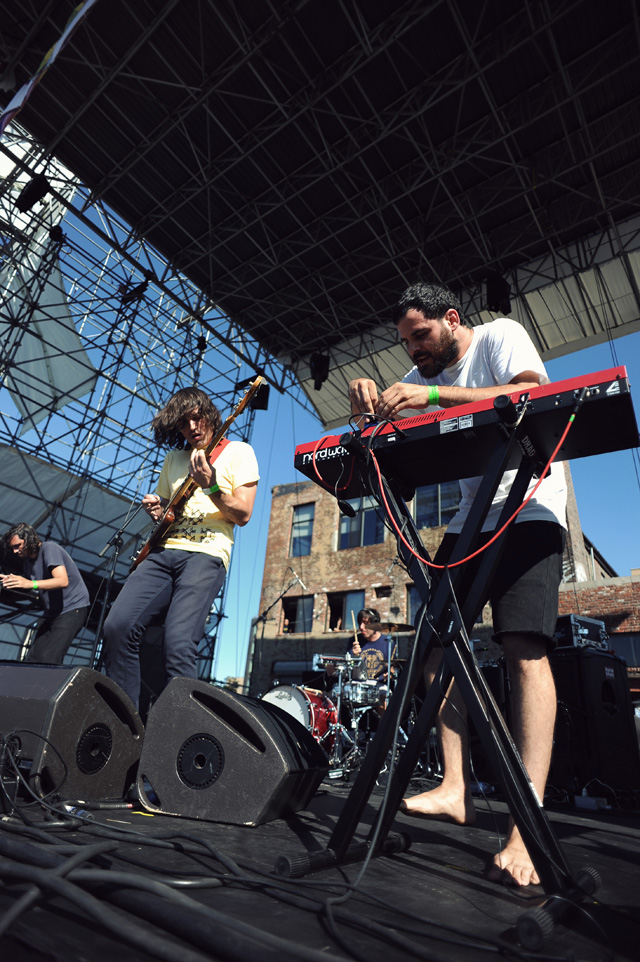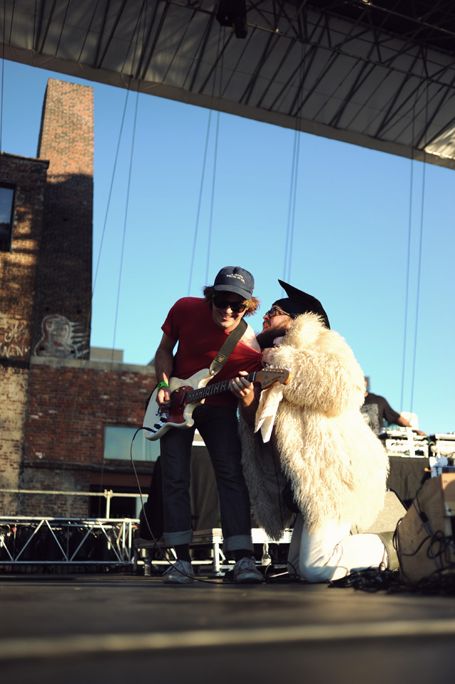 Stereogum's relationship with the series goes back to where it all began: We co-curated the very first Pool Party, bringing Les Savy Fav to a slightly elevated stage sitting on the lip of the deep end of a disused, dried out McCarren Pool. Five years on, McCarren is becoming an actual pool, the parties take place at the Williamsburg Waterfront where it is a Pool Party in name only, and Tim Harrington's presence yesterday served as a bearded bookend, fitting as he's cemented a status as the neighborhood elder/mascot/ubiquitous trickster over the past half-decade.