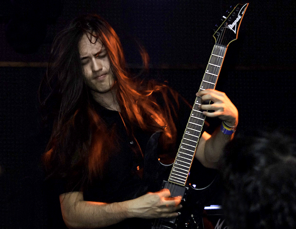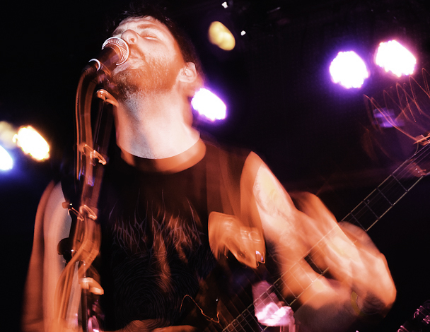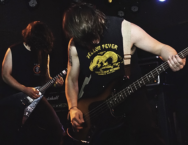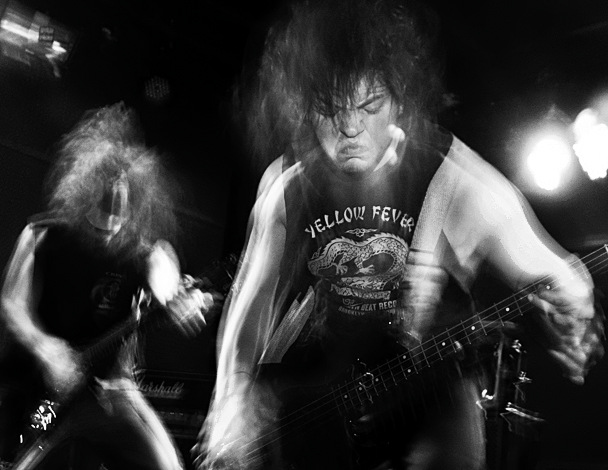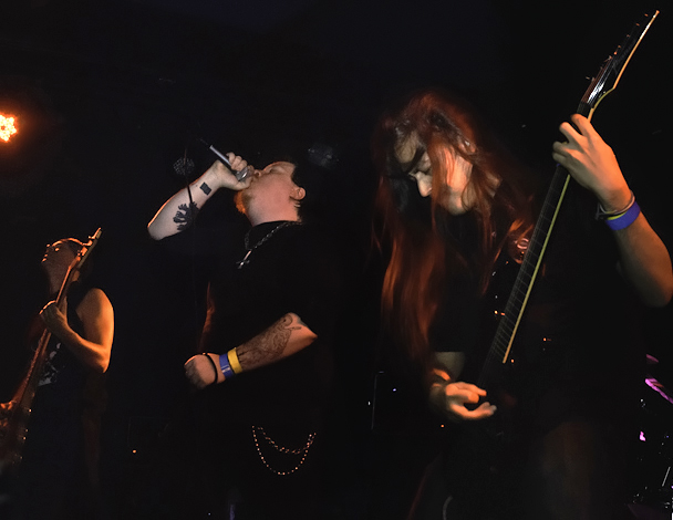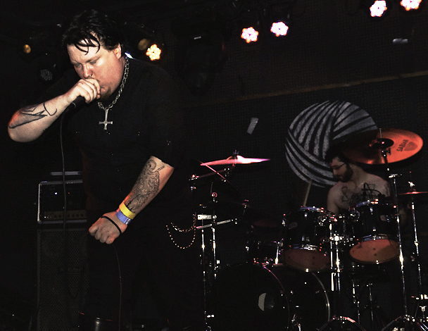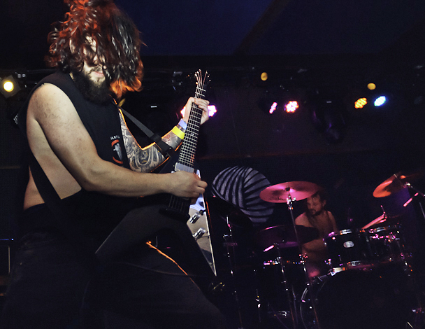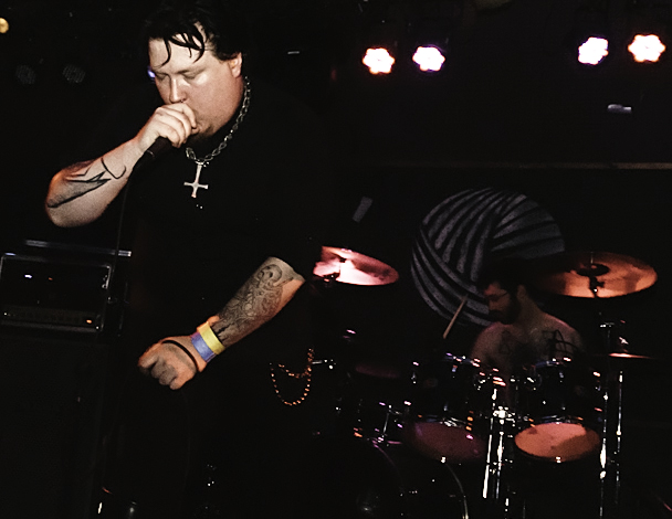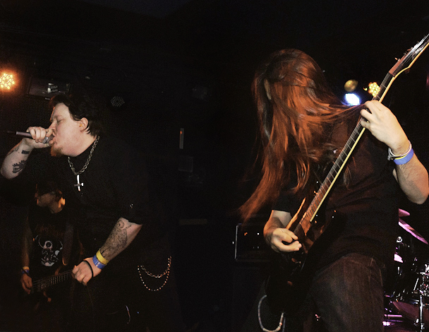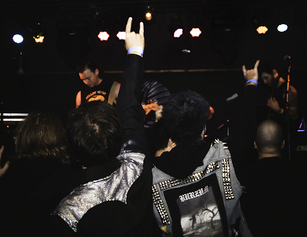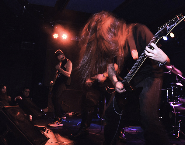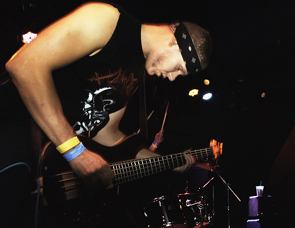 The official date of this weekend's Haunting The Chapel/BrooklynVegan Krieg/woe show was Saturday, 10/30, but we started the Mischief Night/Halloween event after midnight to make sure the East Coast black metal crews offered the first dark sounds you heard on 10/31. As mentioned, both bands own 2010 standout releases (both on Candlelight). On Sat/Sun, they also shared members: After ripping into Quietly, Undramatically with his boozy Philly cohorts (and HTC live regulars), woe main man Chris Grigg handled drums (ably) for Krieg's set. It was an excellent night complete with black metal pogoing and a few audience members wearing facepaint, though unfortunately, unlike the Mt. Eerie/Liturgy/Malkuth show I did last Halloween, nobody showed up dressed like a banana. No worries: Samantha Marble took photos decked-out like a self-described "child of the damned."