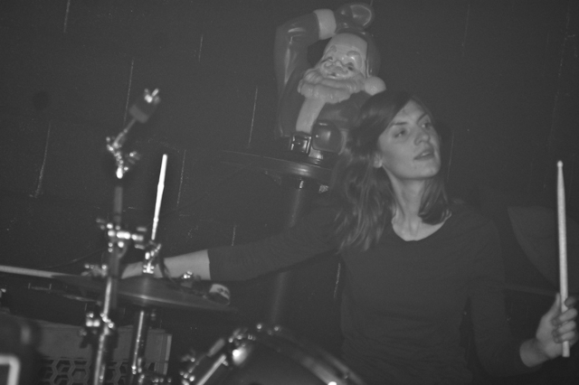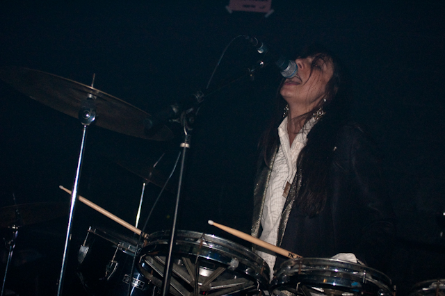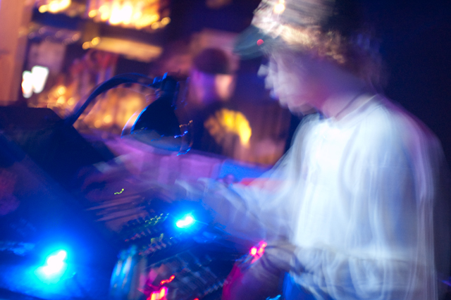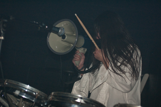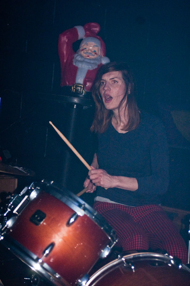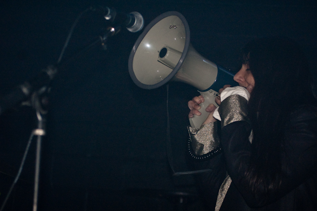 Our new weekly series with Spencer Sweeney at Santos Party House got off to a good start last night, thanks to those who made it. The party's held in Santos' underground space, which is pretty fitting: The vibe wasn't your normal downtown art party, or at least not a normal downtown art party during this decade. It was weird, fun, and cheap ($10 door, $5 with RSVP). Last night was curated and anchored by Lizzi from Gang Gang and her partner in I.U.D. Sadie Laska. You walked into the room and through a labyrinth of slatted and draped garbage bags to a recessed performance space and raised DJ booth. There were films of toads on the walls by Alex Bag (he gets his shit in the Whitney so, you know, arty), and the time that wasn't filled by DJ Matt Manderson of the Neon Kobra Krew's intensity brought a noisy, clattering, rad set from I.U.D. Can't promise that any of that will happen again -- each week's personality is left to our carousel of curators -- but we're pretty confident it'll always be as odd and engaging. Coming weeks promise Thurston Moore, Gibby Haynes, Hisham Bharoocha, Matt Sweeney, Daniel Higgs of Lungfish, and etc. You should come sometime. Here's a flyer to get you through March: