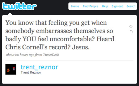 The original note's at Reznor's Twitter. Not that we're pretending there's some sort of beef between the two singers -- gossip? us? -- but you really can't argue with Trent here. Not that Chris would care to. The guy who wrote "Outshined" describes his new album as "an interesting sociological experiment" and is having a blast confounding fans ("there's some excitement that I got out of that that I haven't felt in years") according to a Reuters interview.