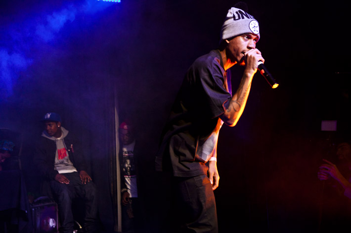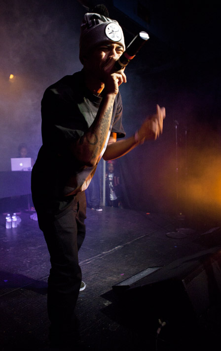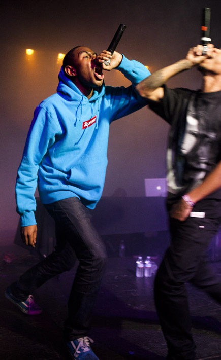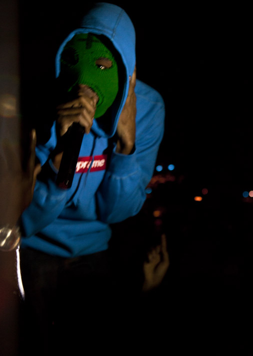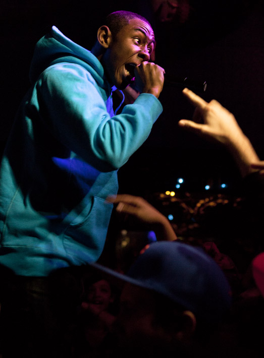 When the lyrically divisive and button pressing though unquestionably gifted Tumblr-centric Los Angeles rap crew Odd Future Wolf Gang Kill Them All played their first show in NYC, most every media outlet in the city had a delegate present (shout out). Already known though laid bare that night, Odd Future orbits around rapper/producer/mainbrain Tyler, The Creator's undeniable charisma, which is second only to that of his eyeballs. He sucked on inhaler and prowled in compensation for Earl Sweatshirt's absence (or because that is just what he does). Last night Odd Future performed on home turf. I have no idea how much of the L.A. media was there, though it's a good guess most of the L.A. media was there. (Also there: Aziz, a Stroke, Flying Lotus, Nosaj Thing.) Photographer Graeme Flegenheimer managed Not To Get Punched In The Fucking Mouth, took and filed these shots. Download Tyler, The Creator's Bastard and Earl Sweatshirt's Earl, read this piece by Fennessey and this one by Caramanica and this one by Baron, watch Tyler's eyes bug in "French," and the rest of Odd Future's eye's bleed in "Earl," and you'll be primed.