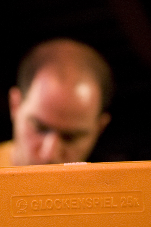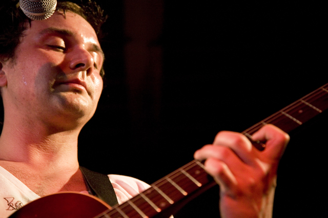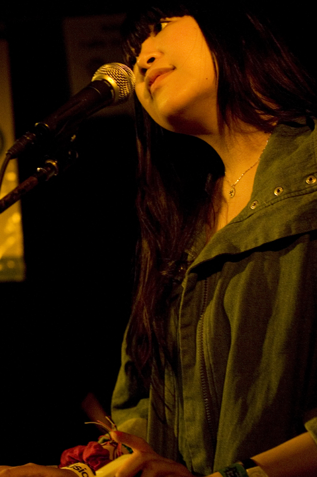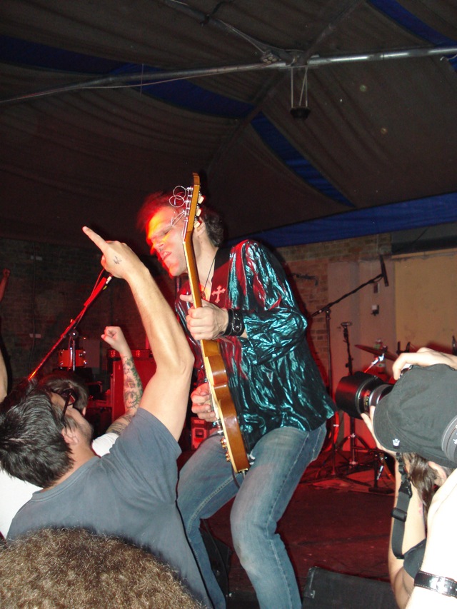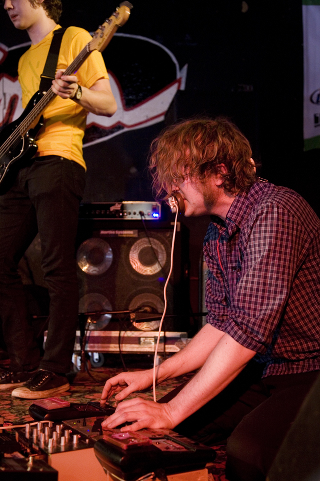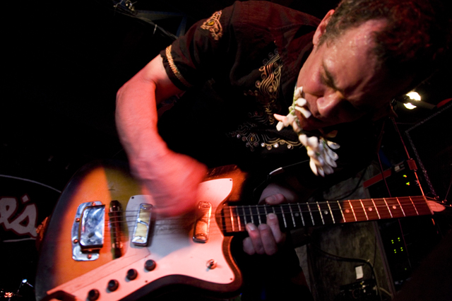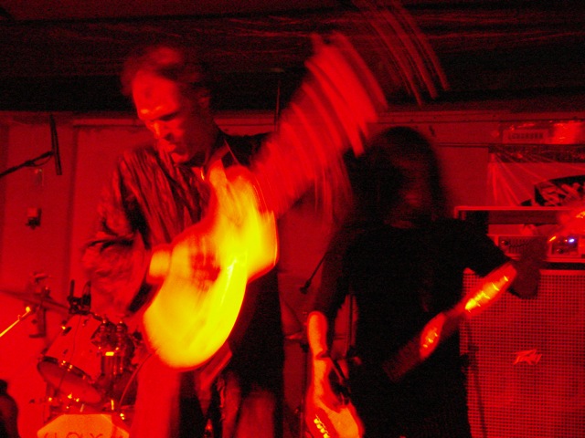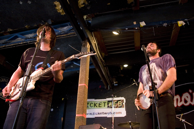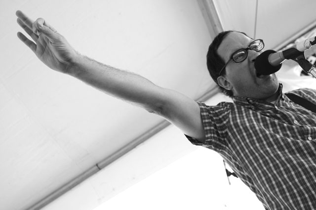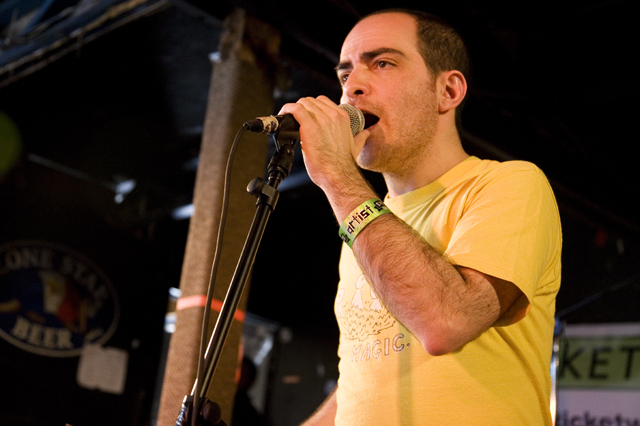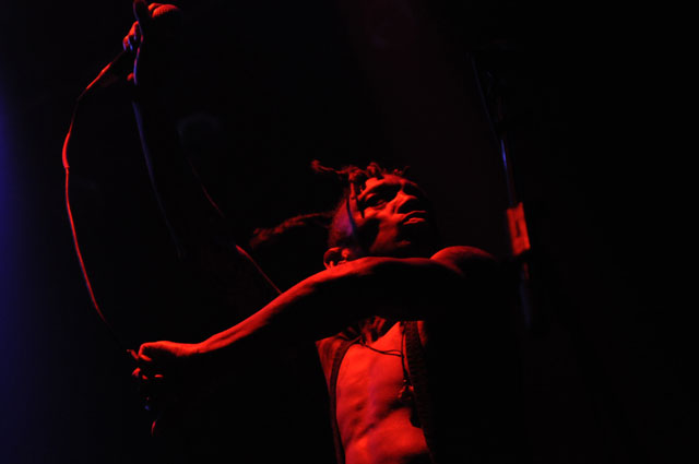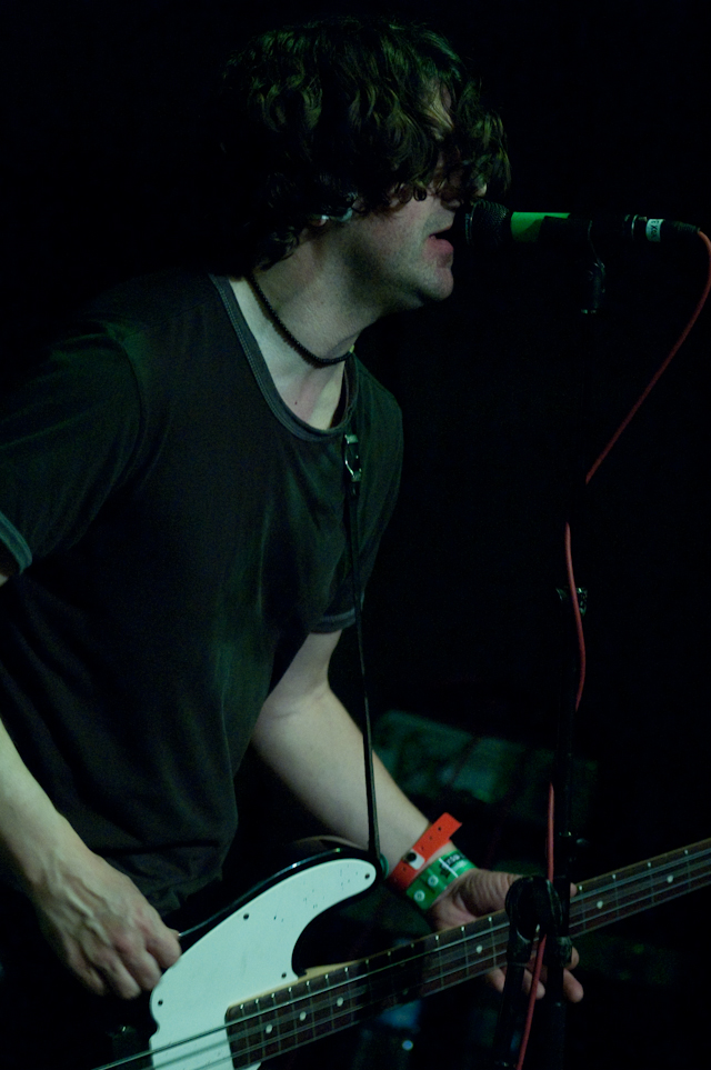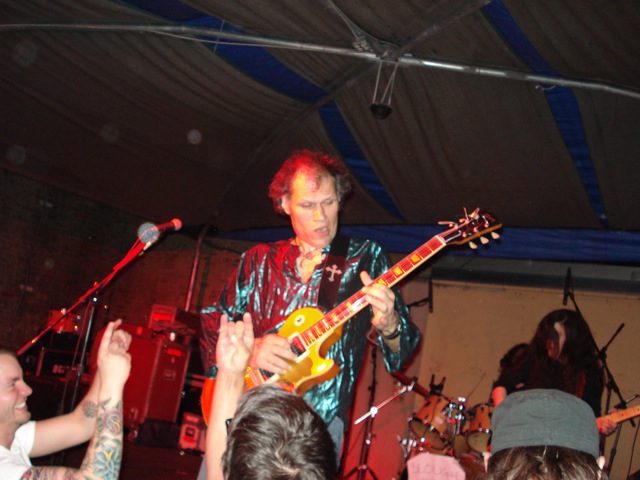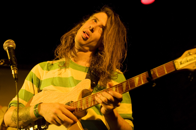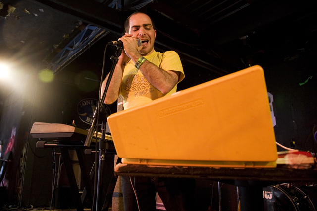 In the surprise move of the festival, Brandon spent Friday night watching lots and lots of metal. As far as the heavy stuff goes, longstanding San Fransisco Hardworlder's Slough Feg's 9PM WFMU/Aquarius Records set at Spiro's Amphitheater was an (and this word is used correctly here) epic power metal blast, even before vocalist/guitarist Mike Scalzi -- the only musician of the week to address the current economic plight, at least to our ears -- removed his shirt and donned a vest. They played a mix of old favorites ("Tiger! Tiger!"!, etc.) and material from the forthcoming Ape Uprising. Goddamn do they write good riffs. They also inspired some of the best drunken dancing of the weekend.