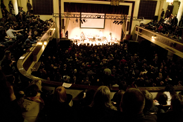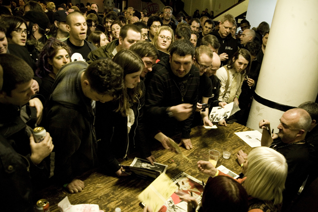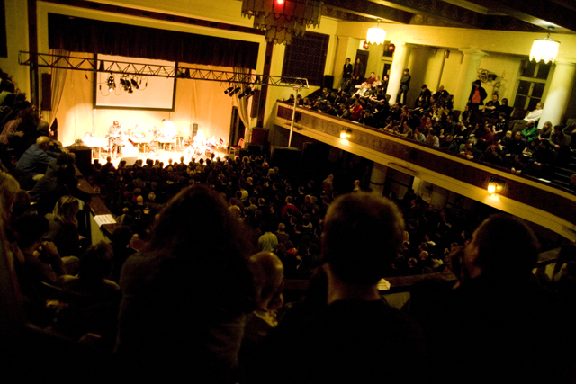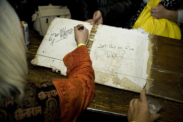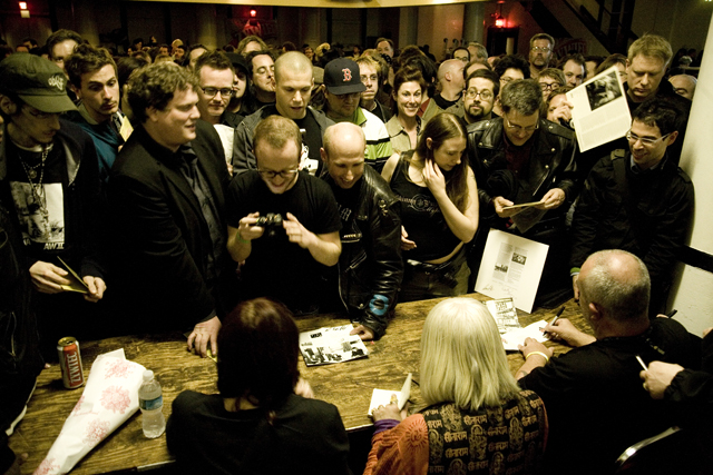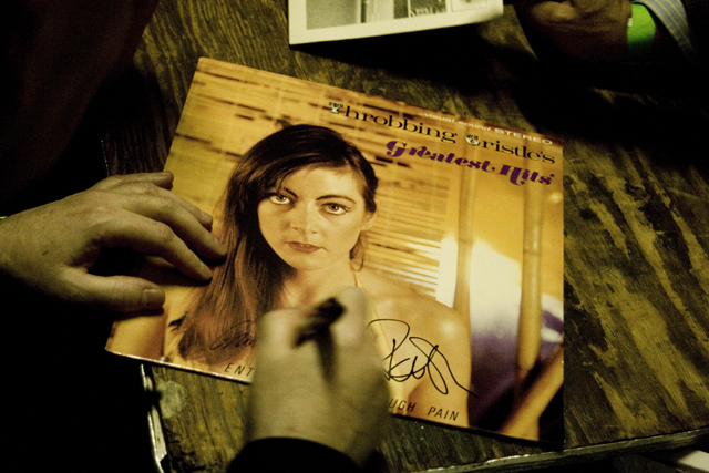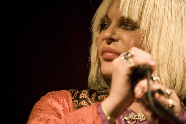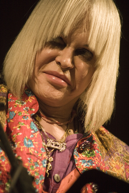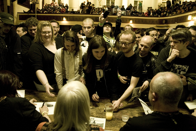 Avant garde post-punk outfit Throbbing Gristle played its first ever NY gig last night. Only 32 years in the making. The industrial music pioneers, led by legendary transgender front person Genesis P-Orridge, previously played the US just twice; those shows took place in 1981 in California, and that's where they'll return this weekend for Coachella. Paul McCartney, Leonard Cohen, Paul Weller, Throbbing Gristle ... is this your Coachella on drugs (Celebrex)? Last night's show at Masonic Temple began with the In The Shadow Of The Sun score followed by a painfully long merch signing session. It was a special occasion, sure, but this before the actual performance? According to our photog Santiago Felipe, as well as various online reviews (and BV commenters), another rub was the decision to leave on the house lights during the main set, which elicited jeers from the crowd. The night was sonically challenging as expected, but hopefully the logistics of a Coachella slot will make lighting design and intermission a non-issue. We'll letcha know Monday. In the meantime you can check out Santi's pics and a video of "Discipline."