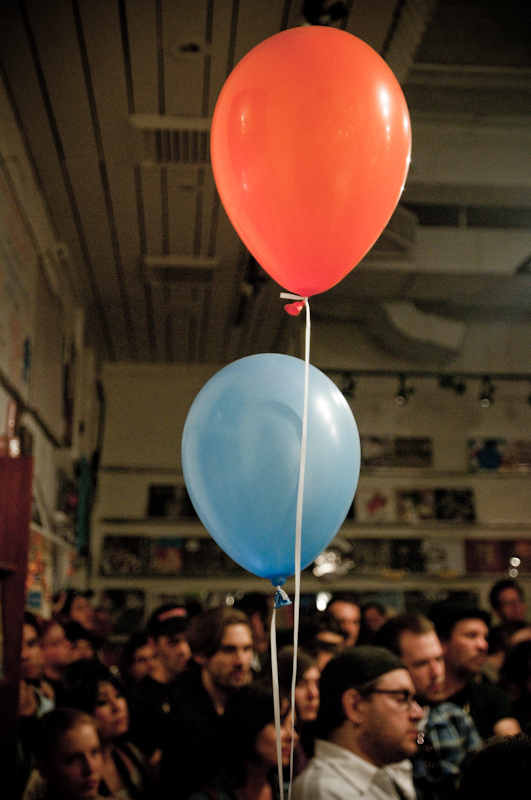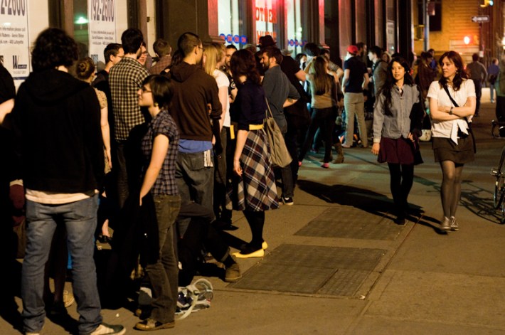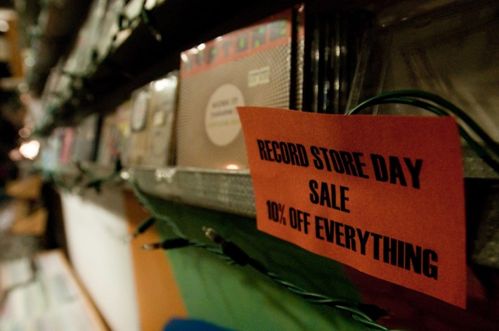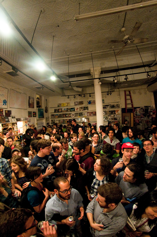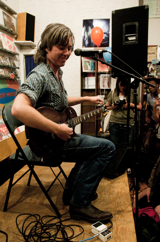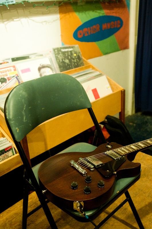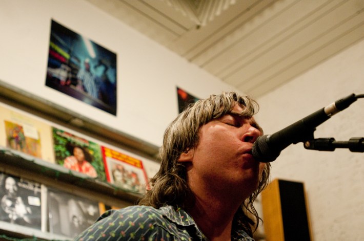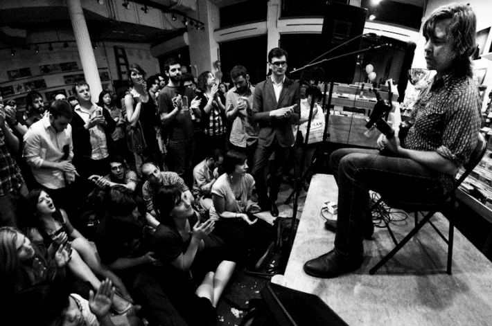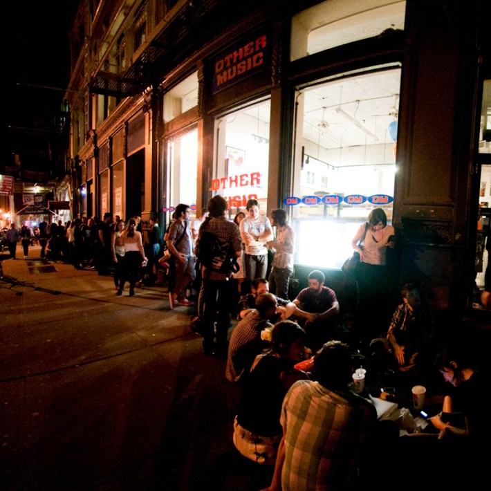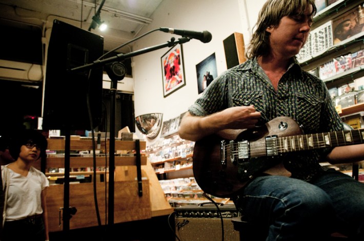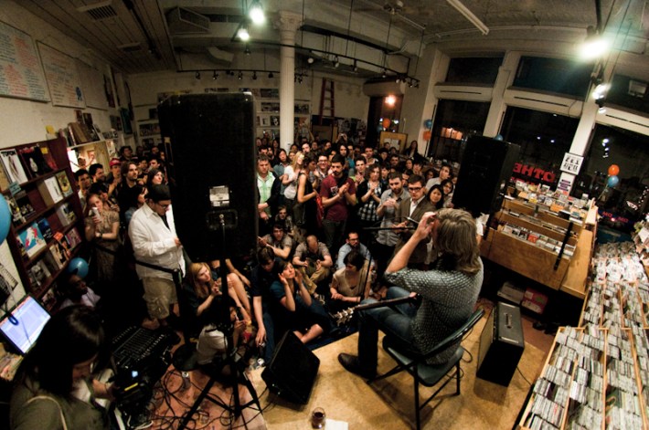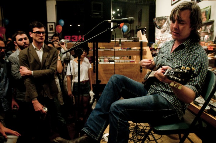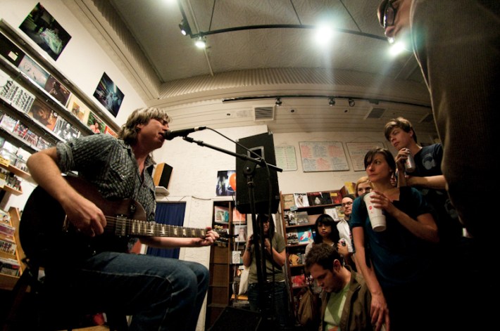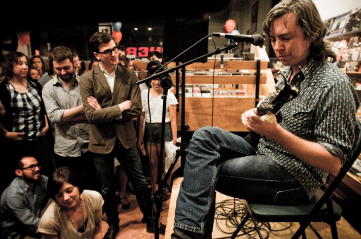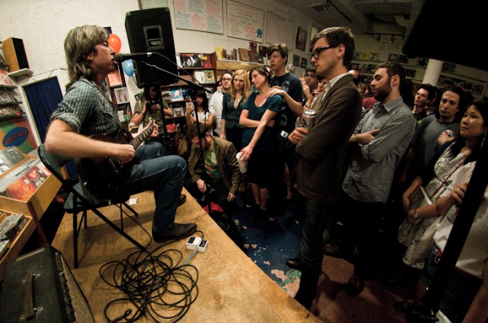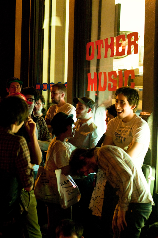 Record Store Day won't save indie brick-and-mortar music retailers, but we can all agree it was a lot of fun. Between the exclusive releases and in-store performances and DJ sets, hopefully you found a reason to celebrate your favorite local shop on Saturday. In its third year RSD spread internationally, and had some heavy hitters on board: Dylan, Springsteen, Elvis Costello, Neil Young, Leonard Cohen, The Smiths, Queen, King Crimson ... you know, typical indie stuff. 2009 represent. The exclusives I was trying to snag sold out long before I even got to East Village institution Other Music. Fair enough, early bird gets the Beck/Sonic Youth split 7". Yet there was still a line just to shop in the store! The last time I waited in line for entry into a record store, I was trying to score Monster tour tickets. DJ sets by Grizzly Bear, The Pains Of Being Pure Of Heart, and The Raveonettes ultimately soundtracked my shopping experience, which was was worth the wait. I snapped some pics in the afternoon and was relieved by photographer Ryan Muir for Bill Callahan's evening set of songs from the avant folkie's Sometimes I Wish We Were An Eagle. Déjà vu. Also worth mentioning: the clerks at Other Music are pretentious assholes. Video proof...
